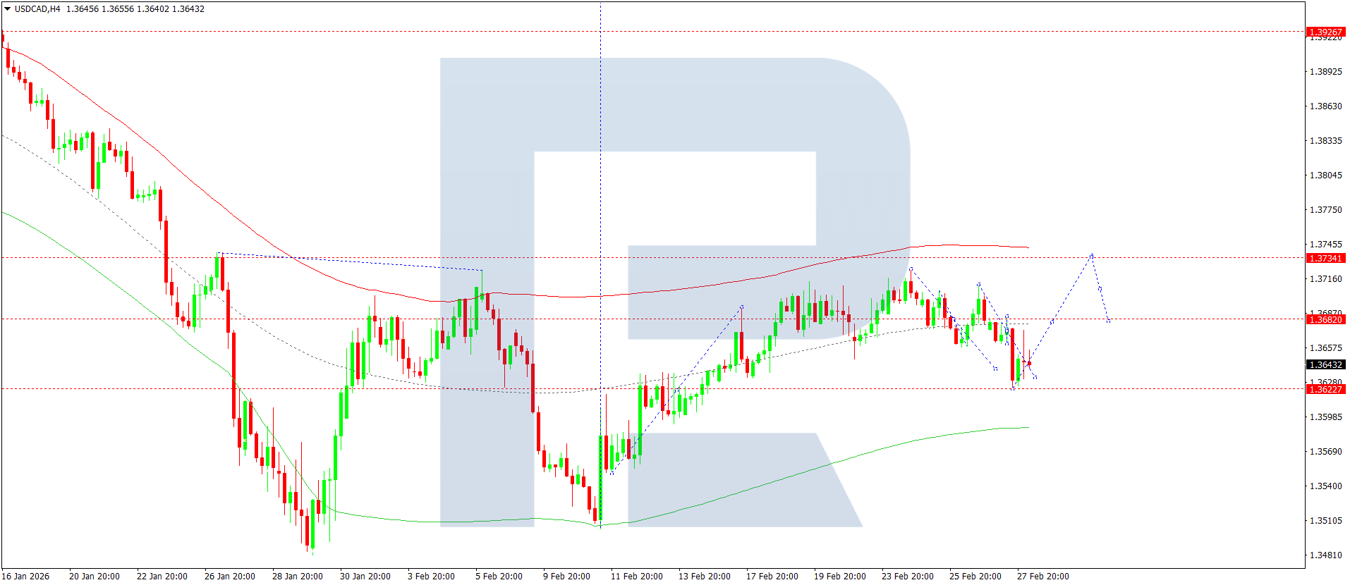 On the H4 chart of the USDCAD pair, the market is forming a consolidation range around 1.3672. Today, 2 March 2026, the market completed a decline wave to 1.3624 and started developing a growth structure towards 1.3737.