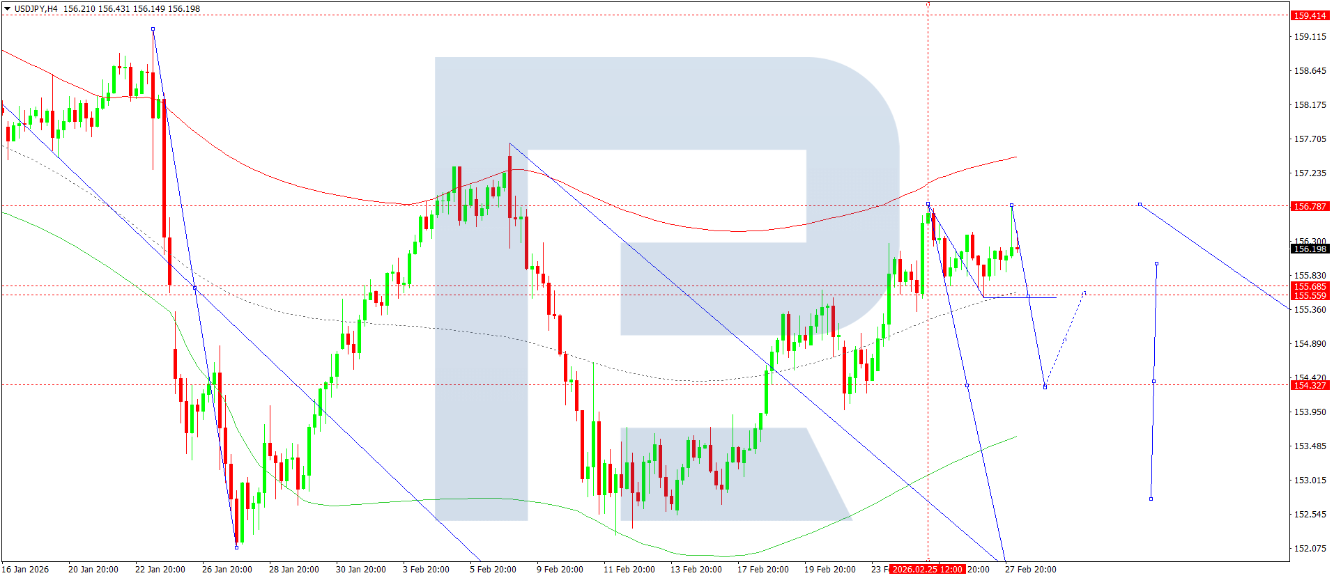 On the H4 chart of the USDJPY pair, the market is forming a consolidation range around 156.00. Today, 2 March 2026, in the event of an upside breakout from the range, the potential for a wave towards 157.70 will open. In the event of a downside breakout, continuation of the decline wave towards 155.45 cannot be ruled out. Further on, the probability of developing a growth wave towards 156.10 will be considered.
