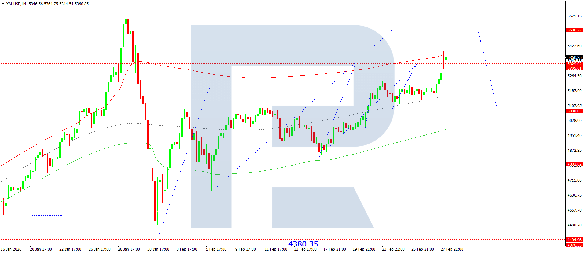 On the H4 chart of XAUUSD, the market completed a growth wave to 5,390. Today, 2 March 2026, development of a consolidation range below this level is expected. In case of an upside breakout from the range, the potential for a wave towards 5,511 will open. In case of a downside breakout, a corrective leg to 5,080 cannot be ruled out.