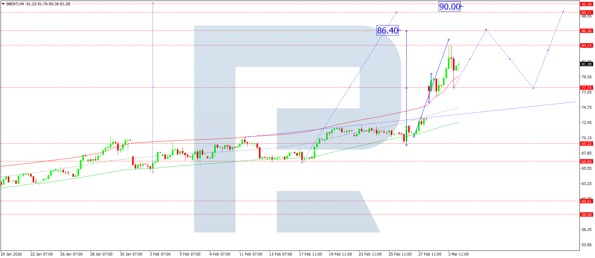 On the H4 chart of Brent crude oil, the market broke above 80.00 and completed a growth wave to 84.14. Today, 4 March 2026, a correction to 77.77 has been completed. Next, an upward move to 85.00 is possible, with prospects for continuation of the trend to 86.40.