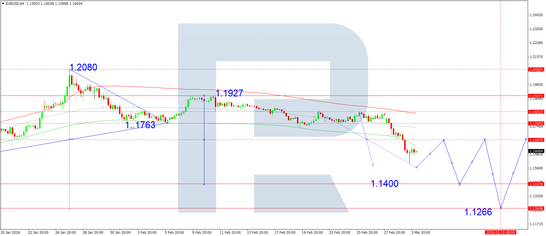 On the H4 chart of the EURUSD pair, the market broke below 1.1666 and completed a downward wave structure, reaching 1.1530. Today, 4 March 2026, a decline to 1.1500 is expected. Next, a corrective move towards 1.1666 is possible, followed by a potential drop to 1.1400, a local target. Subsequently, a correction towards 1.1700 could develop.
