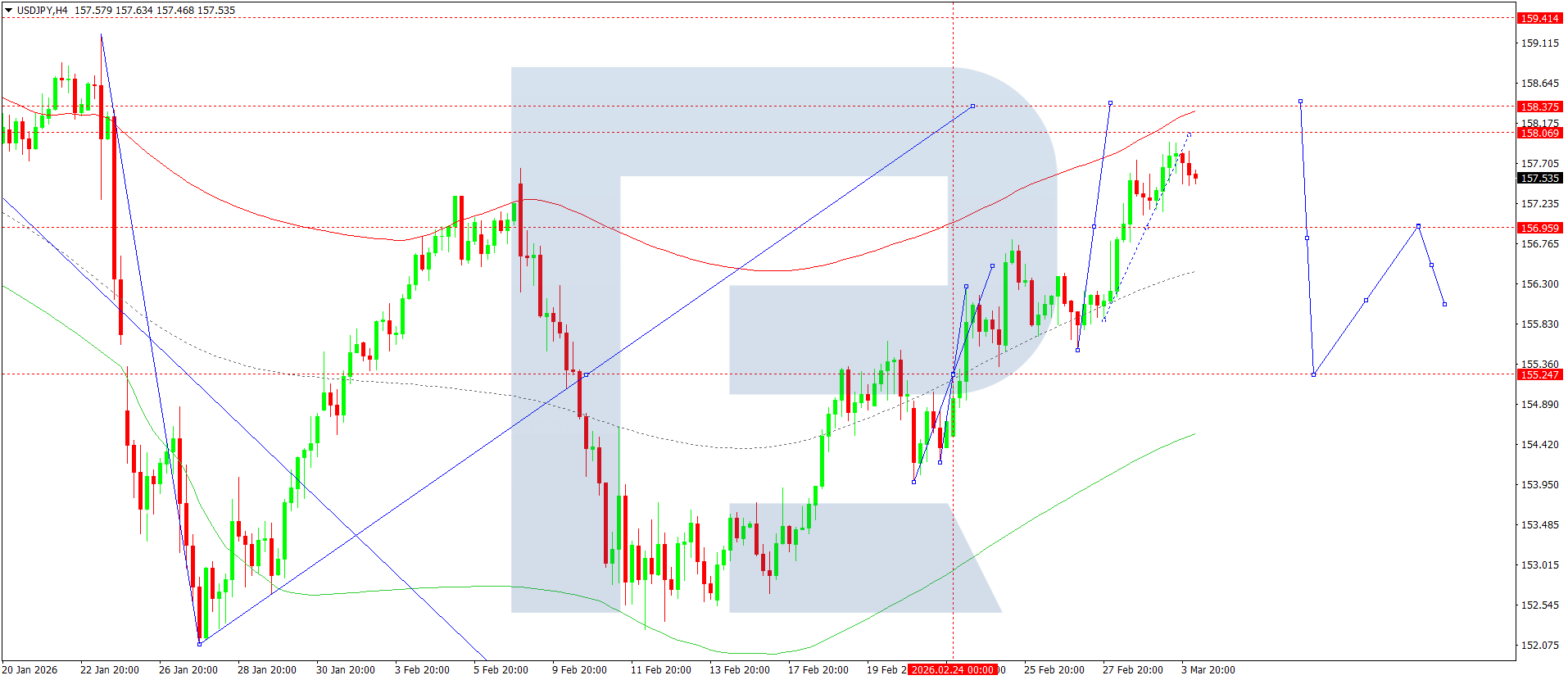 Technical indicators for today’s USDJPY forecast suggest potential growth to 158.08.