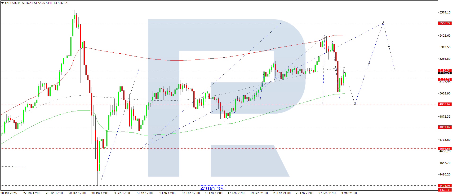 On the H4 chart of XAUUSD, the market completed a downward wave to 5,000. Today, 4 March 2026, a consolidation range above the 5,136 level is expected. An upside breakout from the range would open the door for a wave to 5,246. Conversely, a downside breakout could trigger a downward move to 4,957.