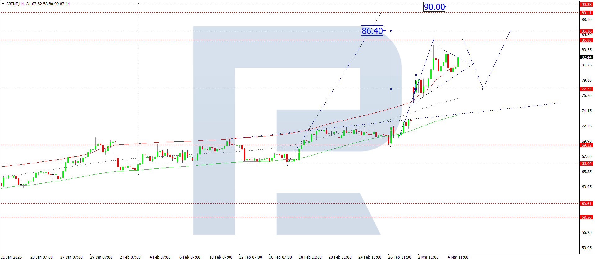 On the H4 chart of Brent crude oil, the market broke above 82.40 and could develop an upward wave towards 85.00. Today, 5 March 2026, prices are expected to reach this target before starting to decline to 77.77. Subsequently, growth to 86.40 is expected, with the trend possibly continuing to 90.00.