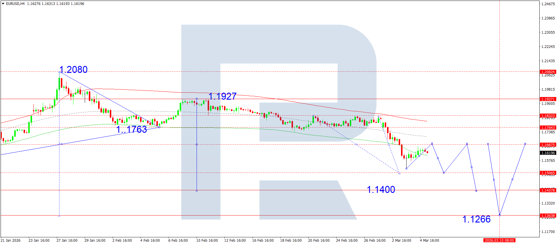 On the H4 chart of the EURUSD pair, the market is forming a consolidation range around 1.1590. Today, 5 March 2026, an upside breakout from the range would open the potential for a wave towards 1.1666, while a downside breakout could trigger a decline to 1.1500. Subsequently, a corrective move to 1.1666 (retesting from below) is possible, followed by a potential decline to 1.1400, a local target. Later, a correction towards 1.1700 could occur.