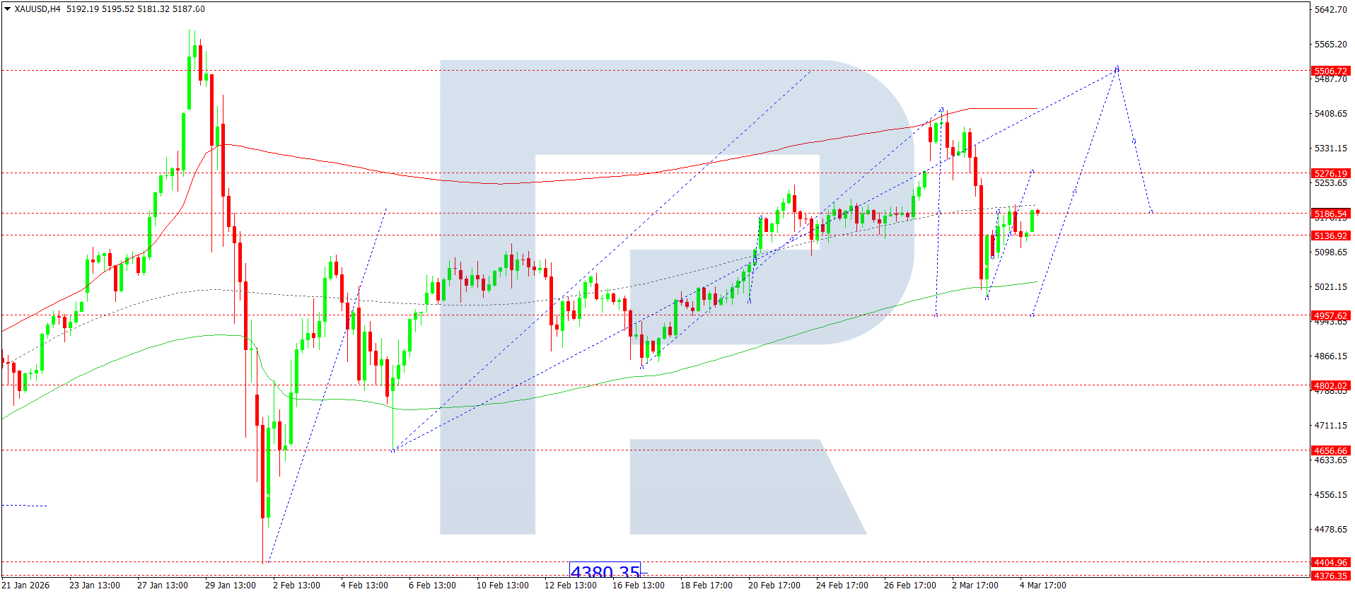 On the H4 chart of XAUUSD, the market completed a downward wave to 5,111. Today, 5 March 2026, a consolidation range is expected to develop above this level. An upside breakout from the range would open the door to a wave towards 5,246, while a downside breakout could trigger a downward move towards 4,957.