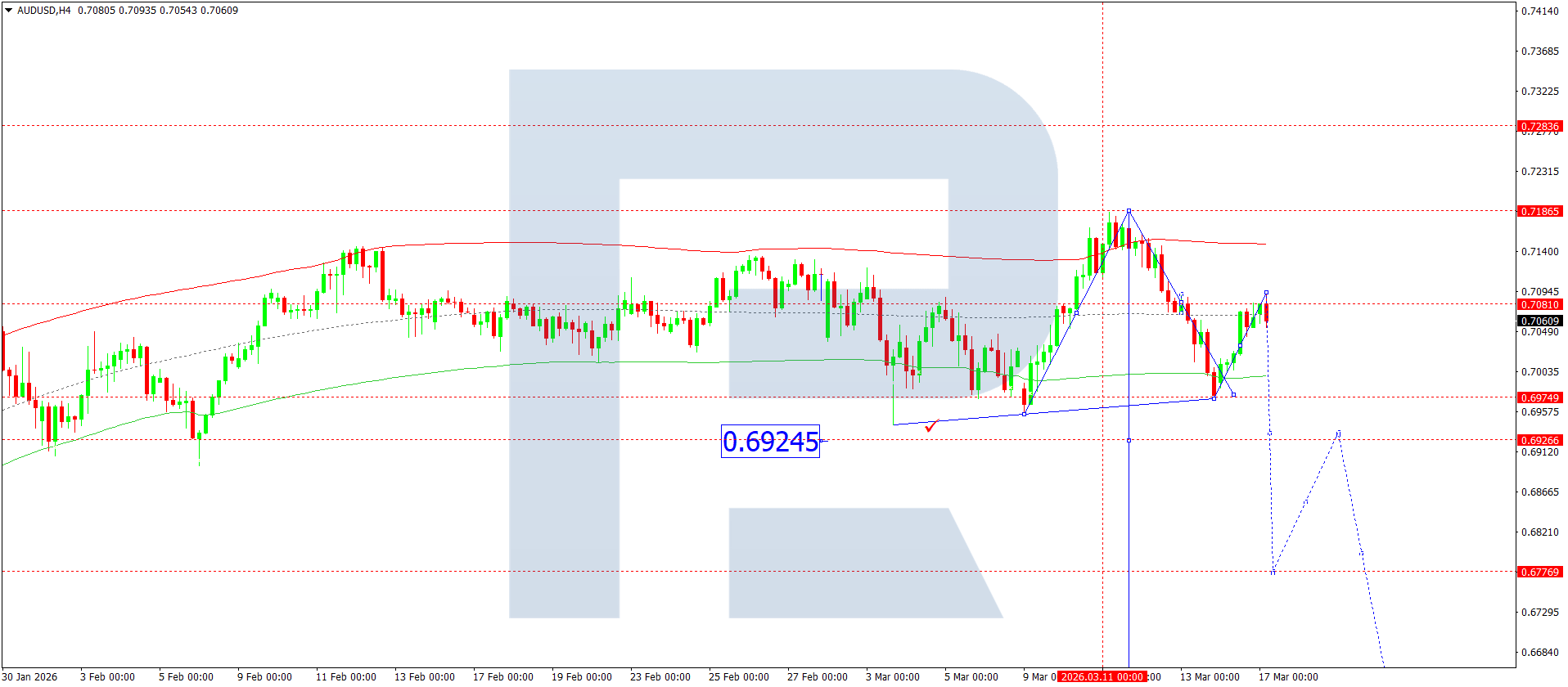 On the H4 chart of the AUDUSD pair, the market broke above 0.7017 and completed an upward wave to 0.7090. Today, 17 March 2026, development of a consolidation range around this level is expected. In the event of a downside breakout, a decline to 0.7010 is expected. After that, the probability of growth to 0.7080 will be considered.