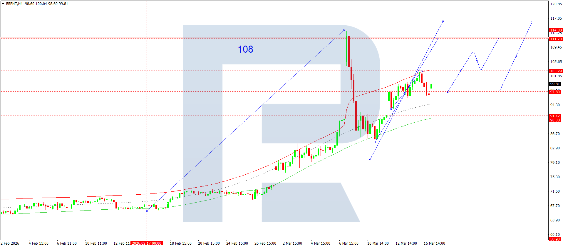 On the H4 chart of Brent crude oil, the market is forming a consolidation range around 98.00. Today, 17 March 2026, the market broke above the range. The probability of continued growth towards 103.30 will be considered, with prospects for continuation of the trend to 110.70. The target is local.