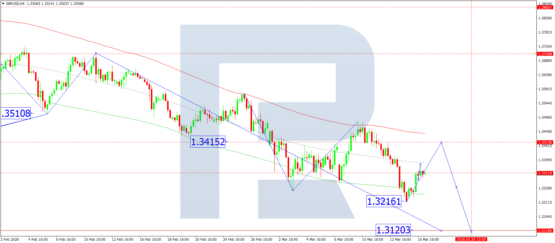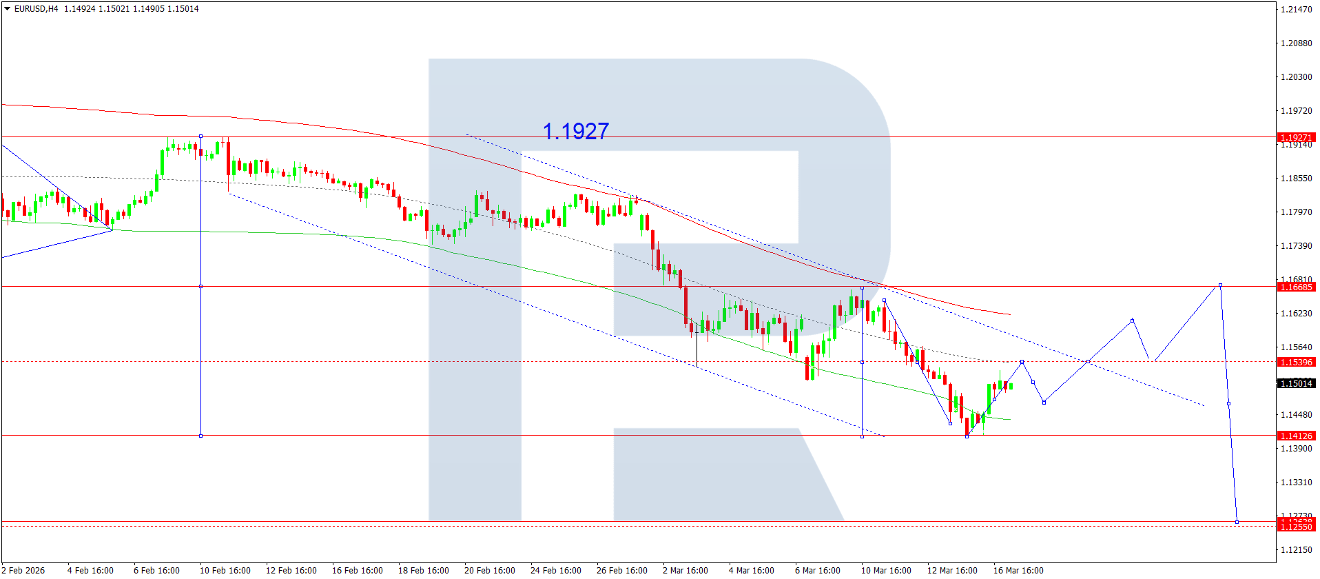 On the H4 chart of the EURUSD pair, the market completed an upward wave to 1.1522. Today, 17 March 2026, a decline to 1.1460 is expected. Essentially, a consolidation range above this level is likely to develop. In the event of an upside breakout from the range, the potential for continuation of the correction towards 1.1540 will open. In the event of a downside breakout, the downward wave may extend to 1.1350.