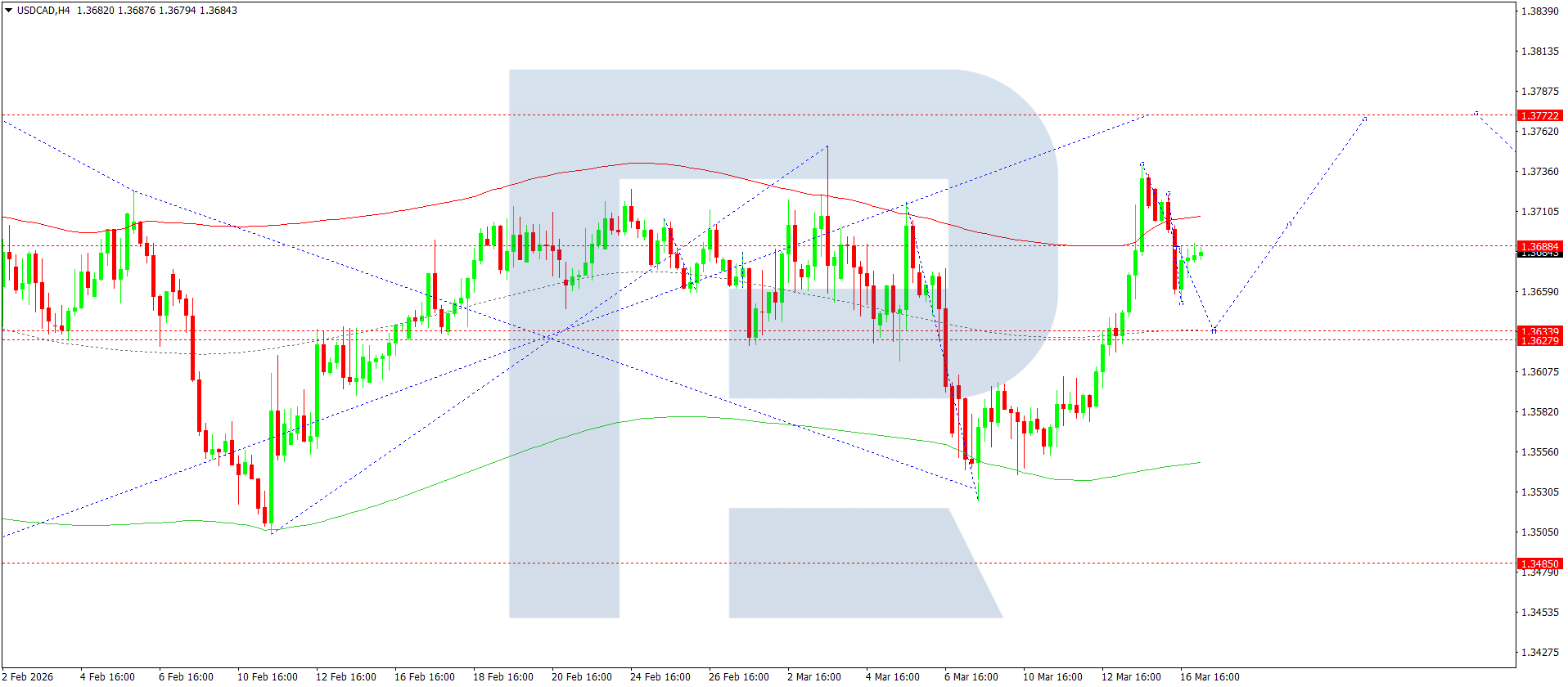 On the H4 chart of the USDCAD pair, the market is forming a downward wave structure towards 1.3636. Today, 17 March 2026, a corrective movement to 1.3636 is expected. After that, growth to 1.3700 may follow, with prospects for continuation of the trend to 1.3777.