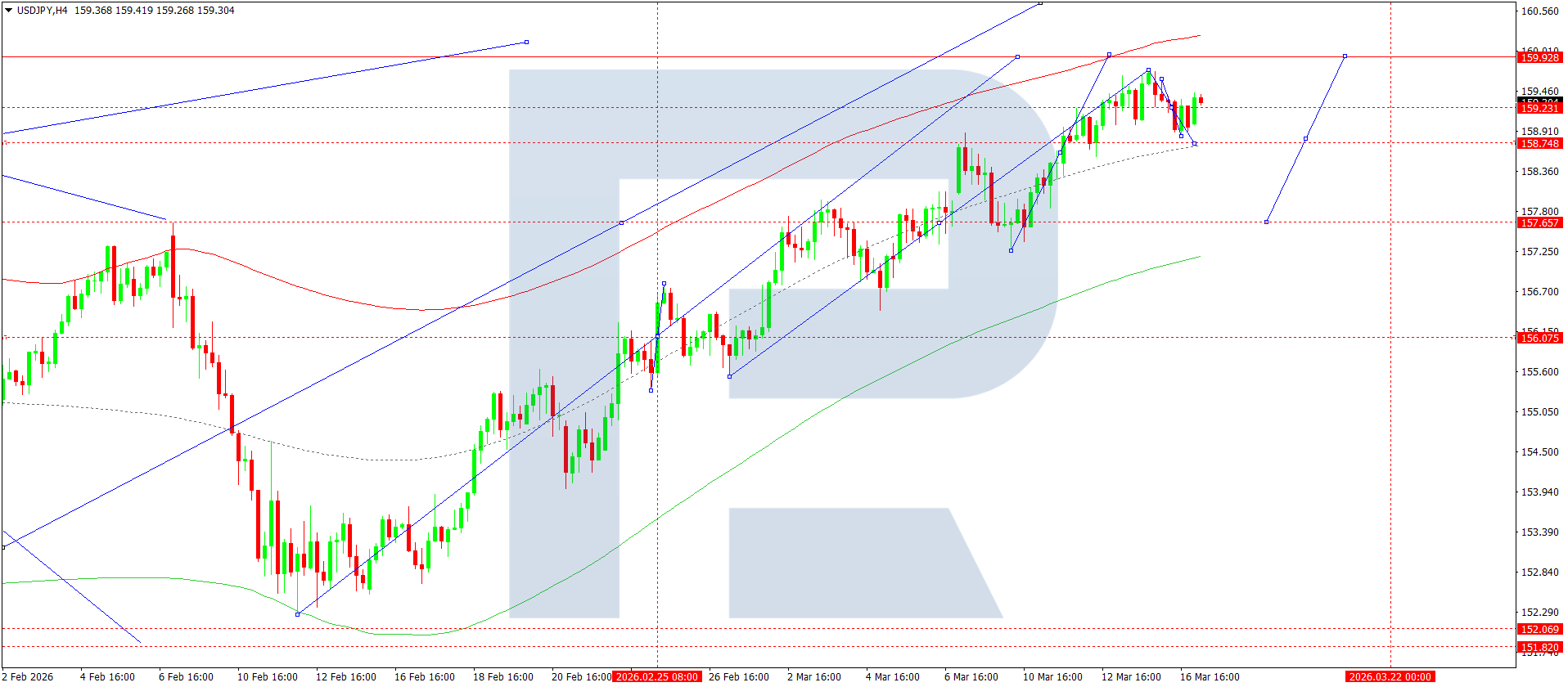 On the H4 chart of the USDJPY pair, the market completed a correction wave to 158.88 and, having received support there, continues developing the upward wave. Today, 17 March 2026, continuation of the wave towards 159.93 is expected. Later, the probability of forming a consolidation range around this level will be considered. In the event of an upside breakout, the potential for a wave to 160.80 will open. In the event of a downside breakout, a corrective wave to 156.00 will be considered.