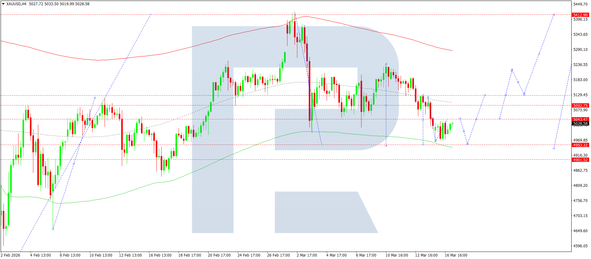 On the H4 chart of XAUUSD, the market broke below 5043 and is forming a downward wave towards 4,954. Today, 17 March 2026, reaching this level is expected. Later, the probability of the beginning of an upward wave towards 5,180 will be considered, with prospects for continuation of the trend to 5,412. As an alternative scenario, if the market breaks lower, another decline leg to 4,900 cannot be ruled out.