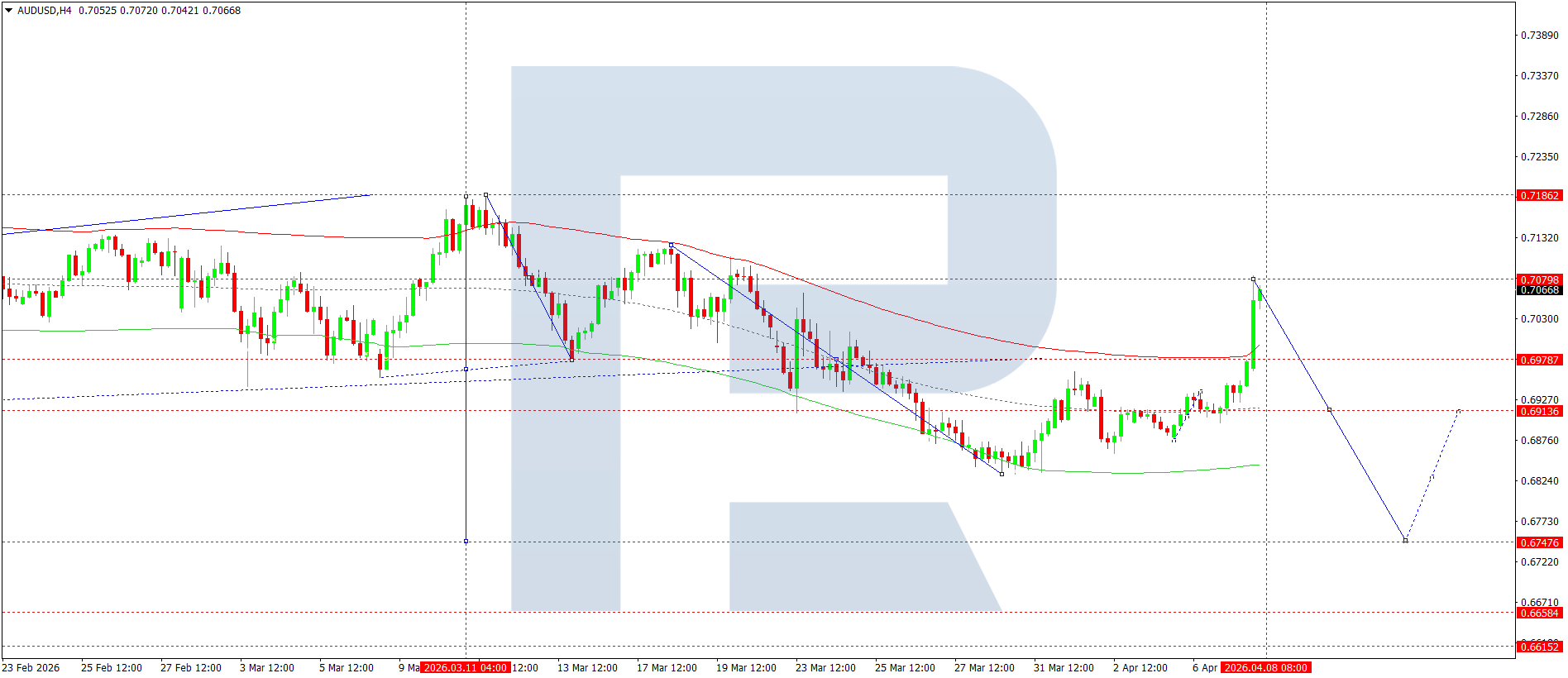 On the H4 chart of the AUDUSD pair, the market completed an upward wave to 0.7070 and formed a consolidation range around it. Today, 8 April 2026, a downward wave is expected to begin, aiming for 0.6920. A breakout below this level would open the potential for continued movement towards 0.6750, a local target.