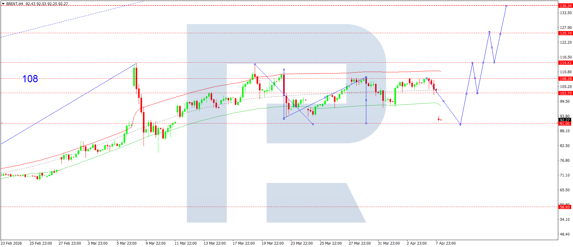 On the H4 chart of Brent crude oil, the market completed a downward structure to 91.00. Today, 8 April 2026, a consolidation range below this level. In case of an upward breakout, the potential for growth to 114.40 will open, with prospects for continuation of the trend to 125.75. The target is local. In case of a downward breakout, a corrective move to 80.00 cannot be ruled out, followed by growth to 102.70.