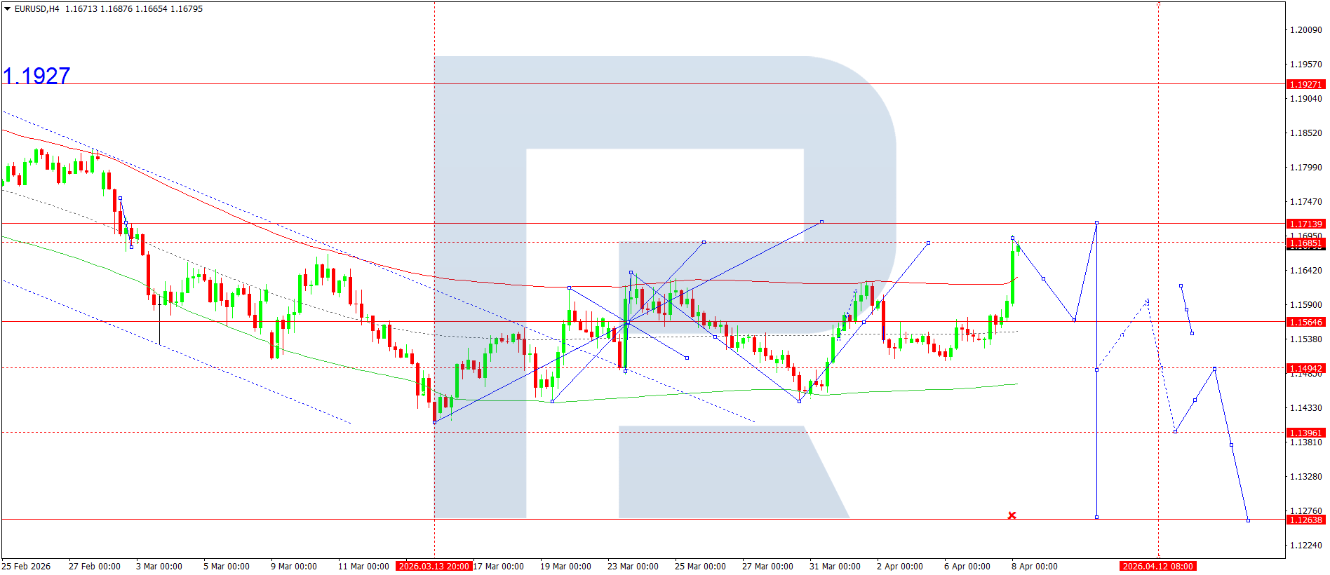 On the H4 chart of the EURUSD pair, the market formed a consolidation range around 1.1560 and broke out upwards. Today, 8 April 2026, an upward wave to 1.1685 has been completed. A correction towards 1.1560 is likely, followed by growth to 1.1711.