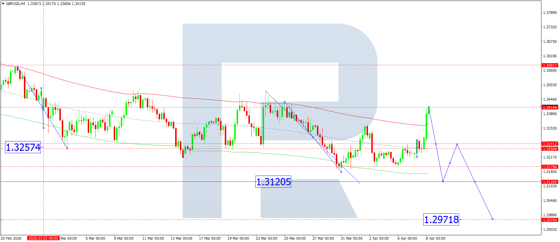 On the H4 chart of the GBPUSD pair, the market formed an upward wave to 1.3420. Today, 8 April 2026, a consolidation range is expected to develop around this level. A downward breakout would open the potential for a decline to 1.3120, while an upward breakout could pave the way towards 1.3500, a local target.