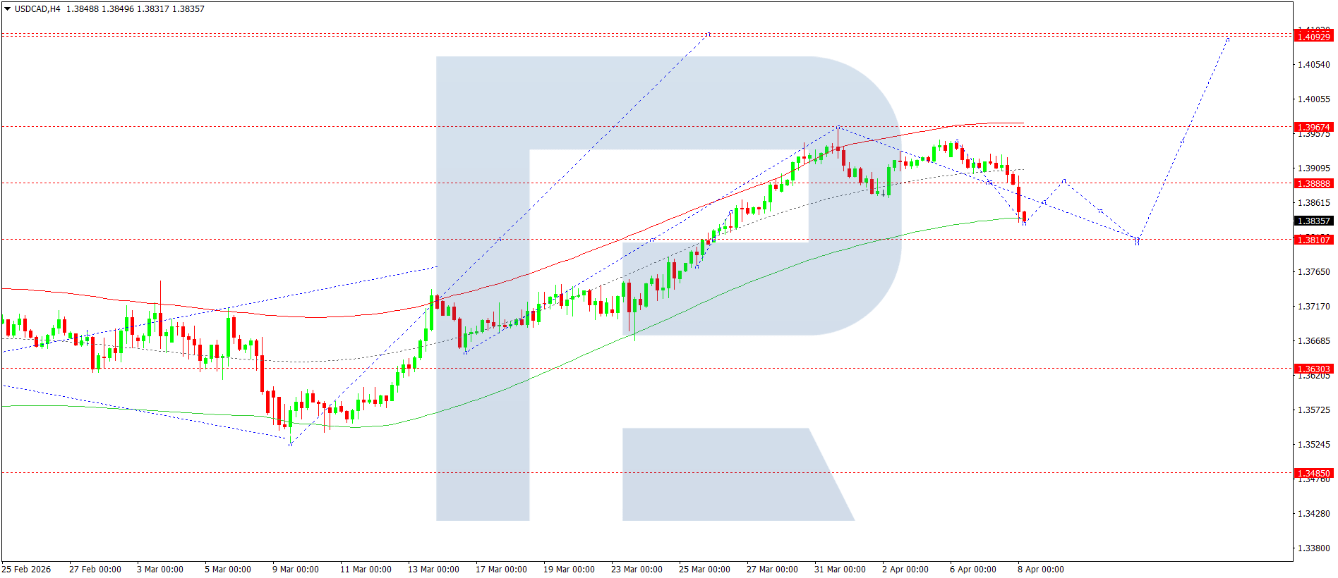 On the H4 chart of the USDCAD pair, the market completed a growth structure to 1.3948 and a decline to 1.3830. Today, 8 April 2026, a consolidation range is expected to develop above this level. In case of a downward breakout, the potential for a decline to 1.3810 will open. In case of an upward breakout, growth to 1.3888 is expected.
