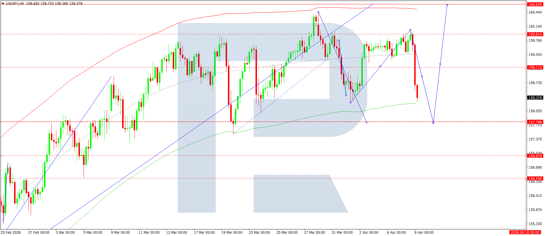 On the H4 chart of the USDJPY pair, the market continues to develop a downward wave towards 157.77. Today, 8 April 2026, the price is expected to reach this target level. Subsequently, an upward wave could begin, aiming for 159.11.