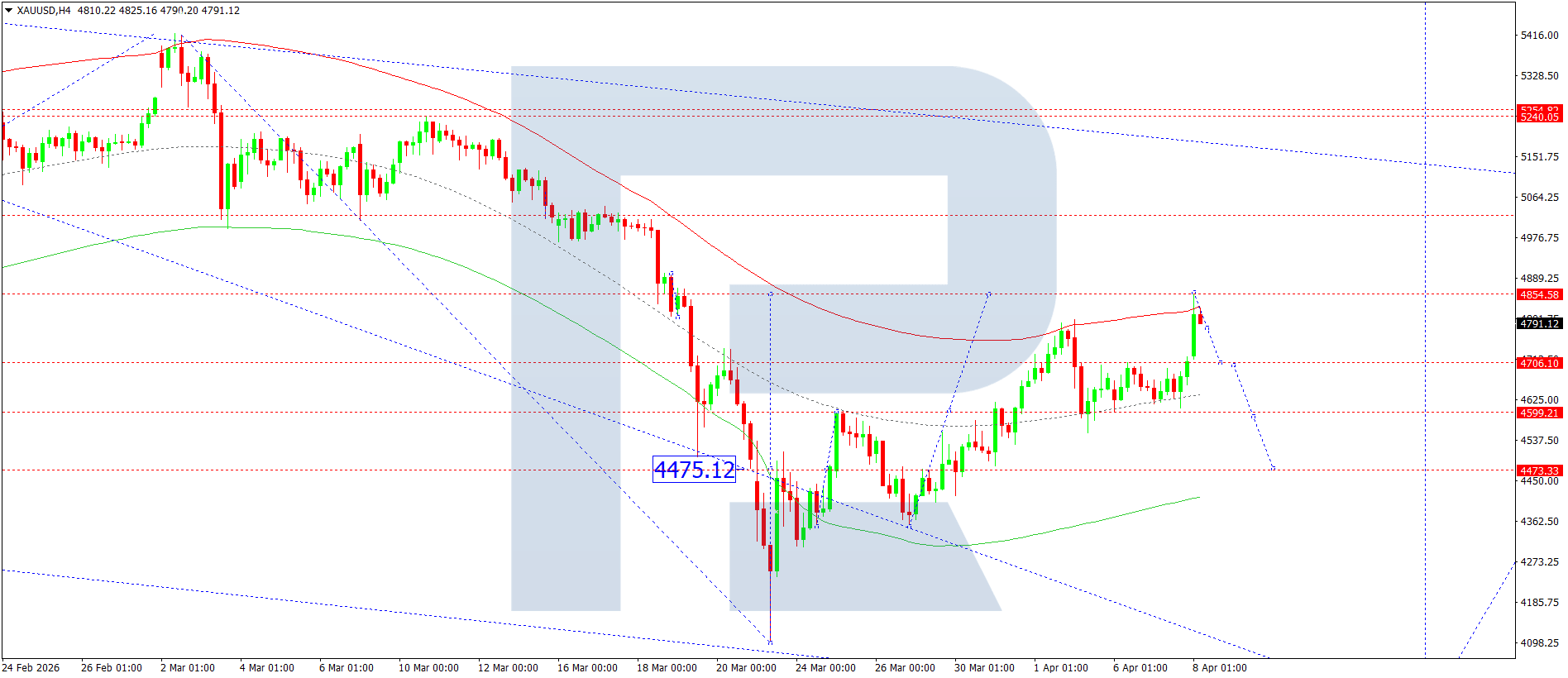 On the H4 chart of XAUUSD, the market completed an upward wave to 4,854. Today, 8 April 2026, a consolidation range is expected to develop around this level. In case of an upward breakout, the potential for growth to 5,000 will open, with prospects for continuation of the trend to 5,045. Alternatively, in case of a downward breakout, another downward move to 4,433 cannot be ruled out. The target is local.