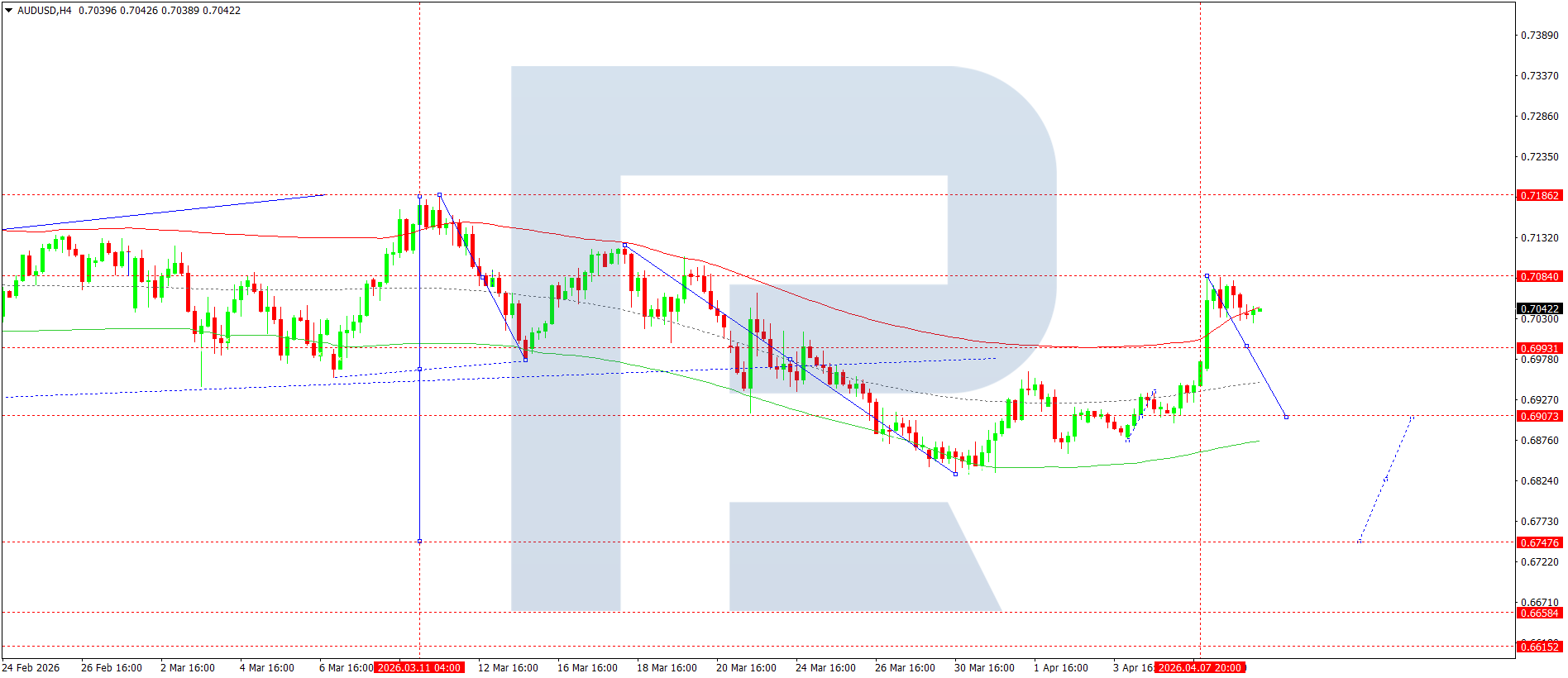 On the H4 chart of the AUDUSD pair, the market completed an upward wave to 0.7084 and formed a consolidation range around it. Today, 9 April 2026, a downward wave to 0.6993 is expected to begin. A breakout below this level would open the way for a continued move towards 0.6908, a local target.