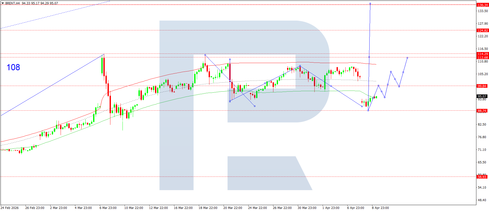 On the H4 chart of Brent crude oil, the market completed a downward structure to 88.78. Today, 9 April 2026, a consolidation range could develop above this level. An upward breakout would pave the way for growth to 99.90 and potentially higher to 112.70, a local target. Conversely, a downward breakout could lead to a corrective move towards 80.00, followed by growth to 112.70.