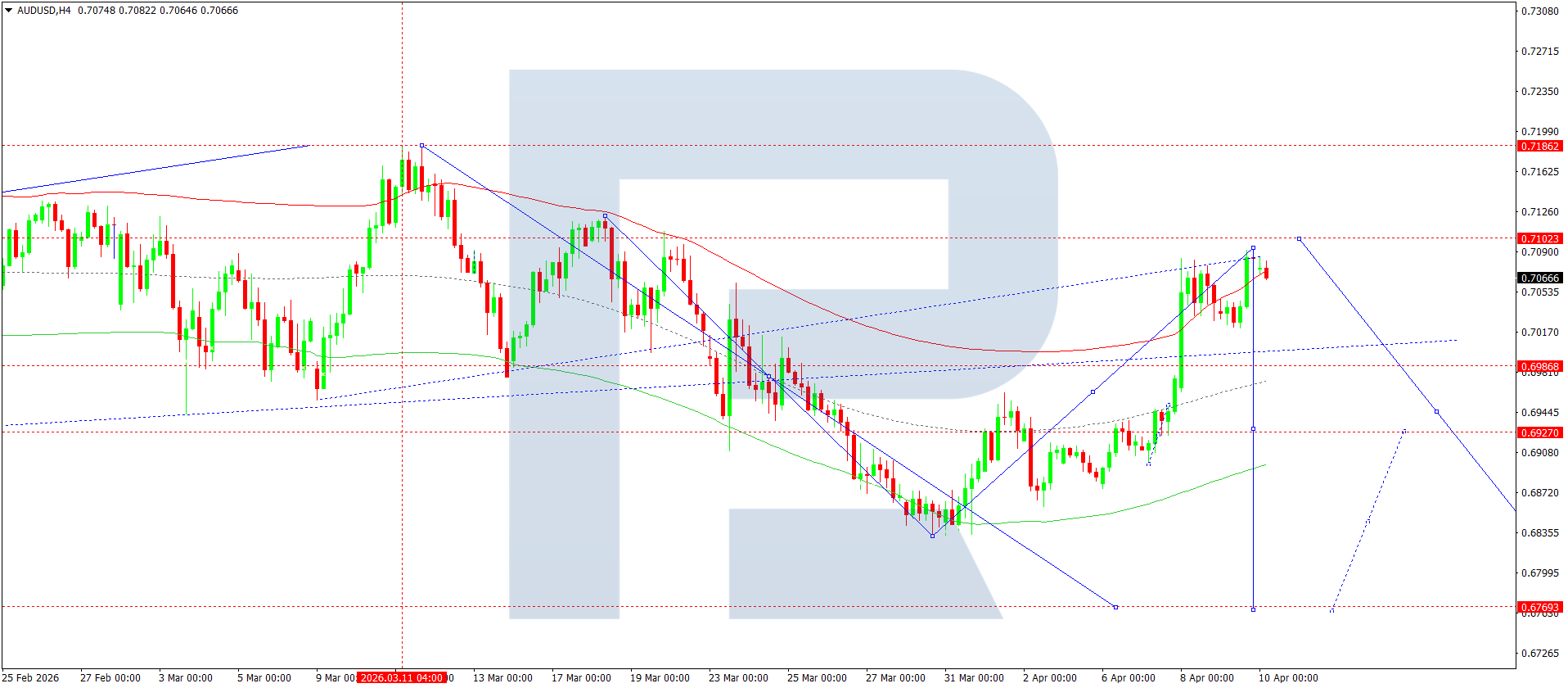 On the H4 chart of the AUDUSD pair, the market completed a growth wave to 0.7090 and formed a consolidation range around it. Today, 10 April 2026, we expect the beginning of a downward wave to 0.6922. In case of a breakout below this level, the potential for continuation of the wave to 0.6767 will open. The target is local.