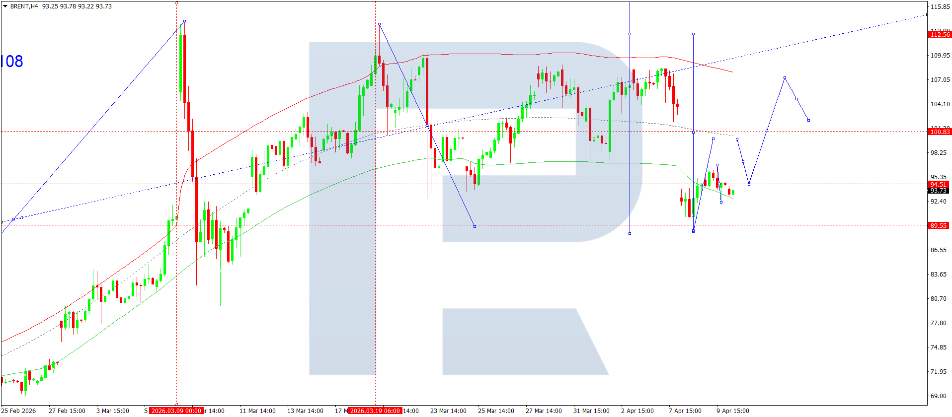 On the H4 chart of Brent crude oil, the market completed a downward structure to 88.78. Today, 10 April 2026, we consider the development of a consolidation range above this level. In case of an upward breakout, the potential for growth to 99.90 will open, with prospects for continuation of the trend to 112.55. The target is local. In case of a downward breakout, a corrective leg to 80.00 cannot be ruled out, followed by growth to 112.55.