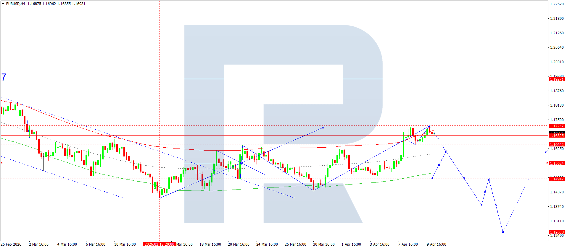 On the H4 chart of the EURUSD pair, the market continues to develop a consolidation range around 1.1682. Today, 10 April 2026, we expect a downward breakout. It is relevant to consider the probability of the beginning of a downward wave to 1.1560. Subsequently, growth to 1.1640 is expected, followed by a decline to 1.1490.