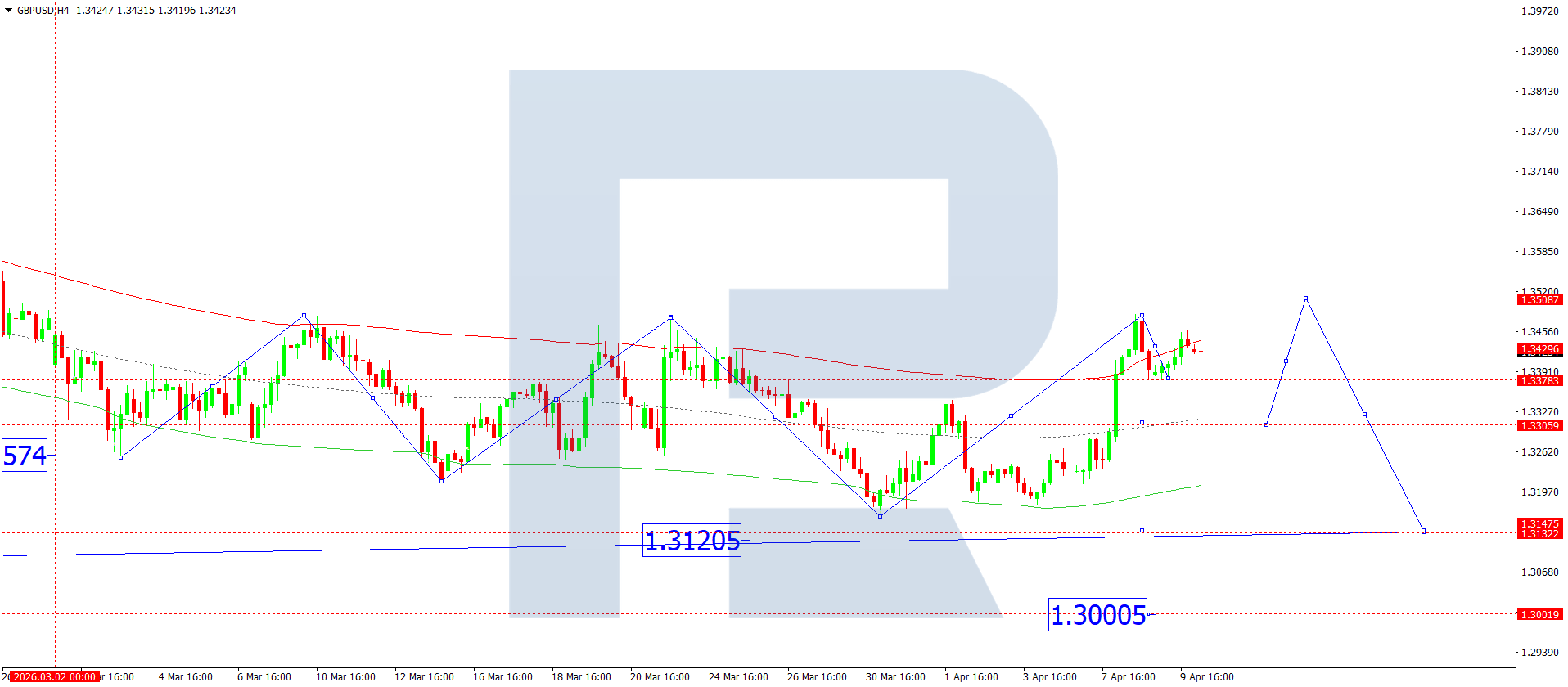 On the H4 chart of the GBPUSD pair, the market continues to develop a consolidation range around 1.3430. Today, 10 April 2026, we expect a downward breakout from this range. This will open the potential for a decline to 1.3303, with prospects for continuation of the trend to 1.3131.