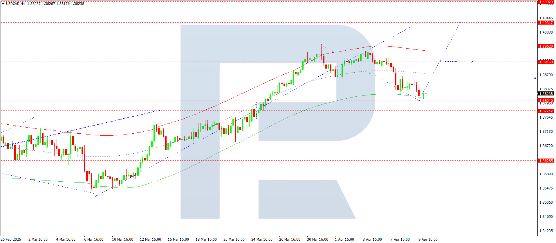 On the H4 chart of the USDCAD pair, the market completed a downward wave to 1.3808. Today, 10 April 2026, we expect the development of a consolidation range above this level. In case of a downward breakout, the potential for a decline to 1.3707 will open. In case of an upward breakout, growth to 1.3919 is expected.