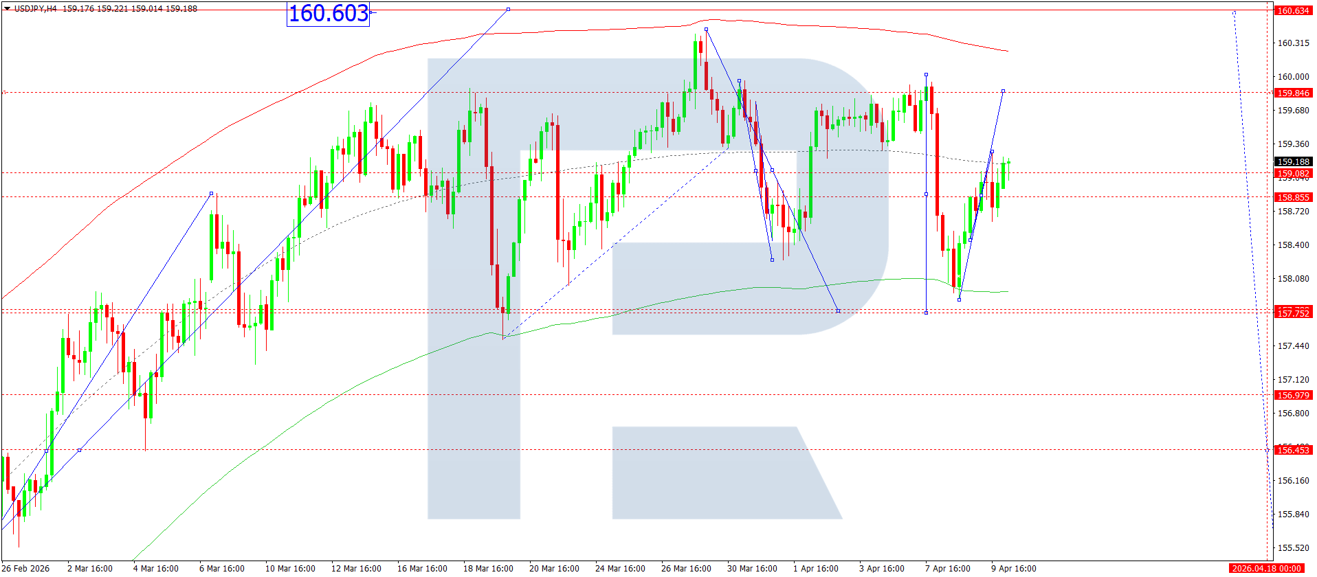 On the H4 chart of the USDJPY pair, the market completed a downward wave to 158.88. Today, 10 April 2026, we expect a growth leg to develop. Further, we consider the probability of a growth wave to 159.22, with prospects for continuation to 159.85.