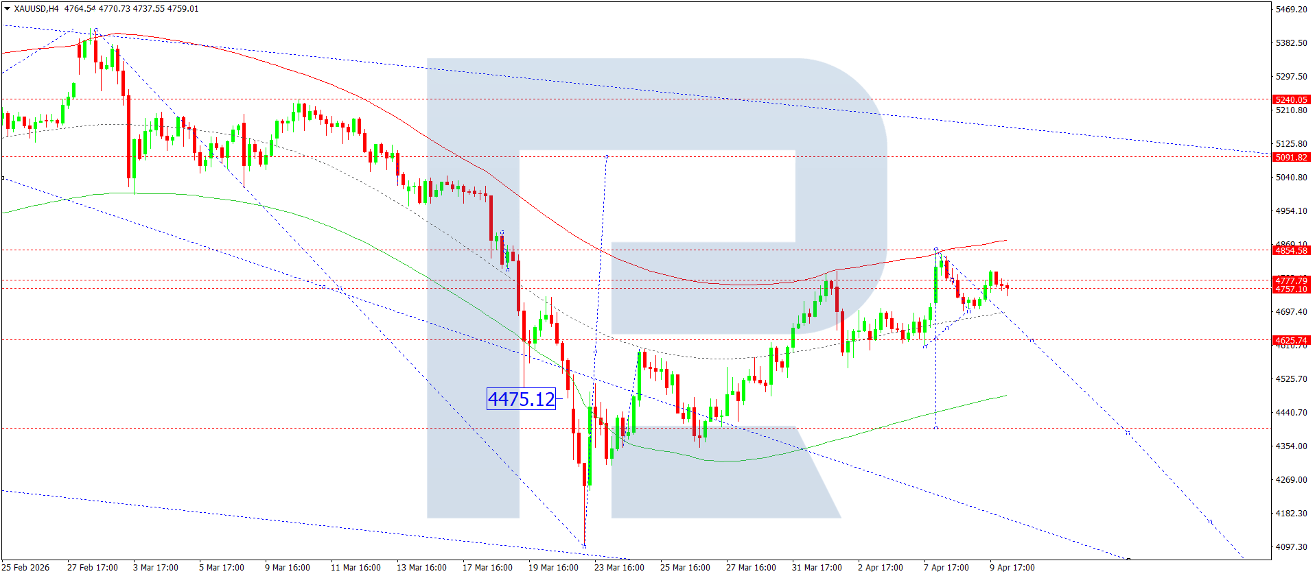 On the H4 chart of XAUUSD, the market completed a growth wave to 4,854. Today, 10 April 2026, we expect the development of a consolidation range below this level. In case of an upward breakout, the potential for growth to 5,000 will open, with prospects for continuation of the trend to 5,045. Alternatively, in case of a downward breakout, another downward leg to 4,407 cannot be ruled out. The target is local.