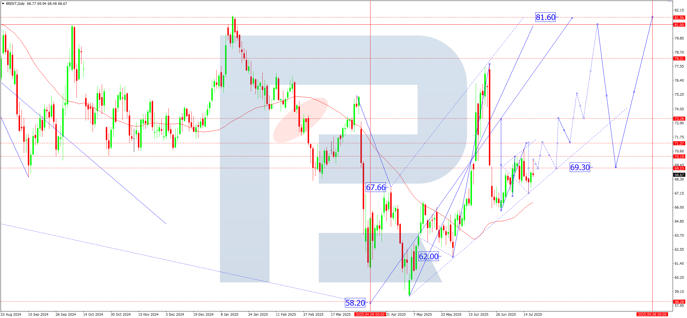 Brent crude is trading within balanced expectations. On one hand, prices are supported by OPEC+ quota compliance and signs of declining US inventories. On the other hand, concerns over global demand, particularly from China and Europe, persist. Geopolitical risks in the Middle East and US dollar volatility also influence short-term momentum.