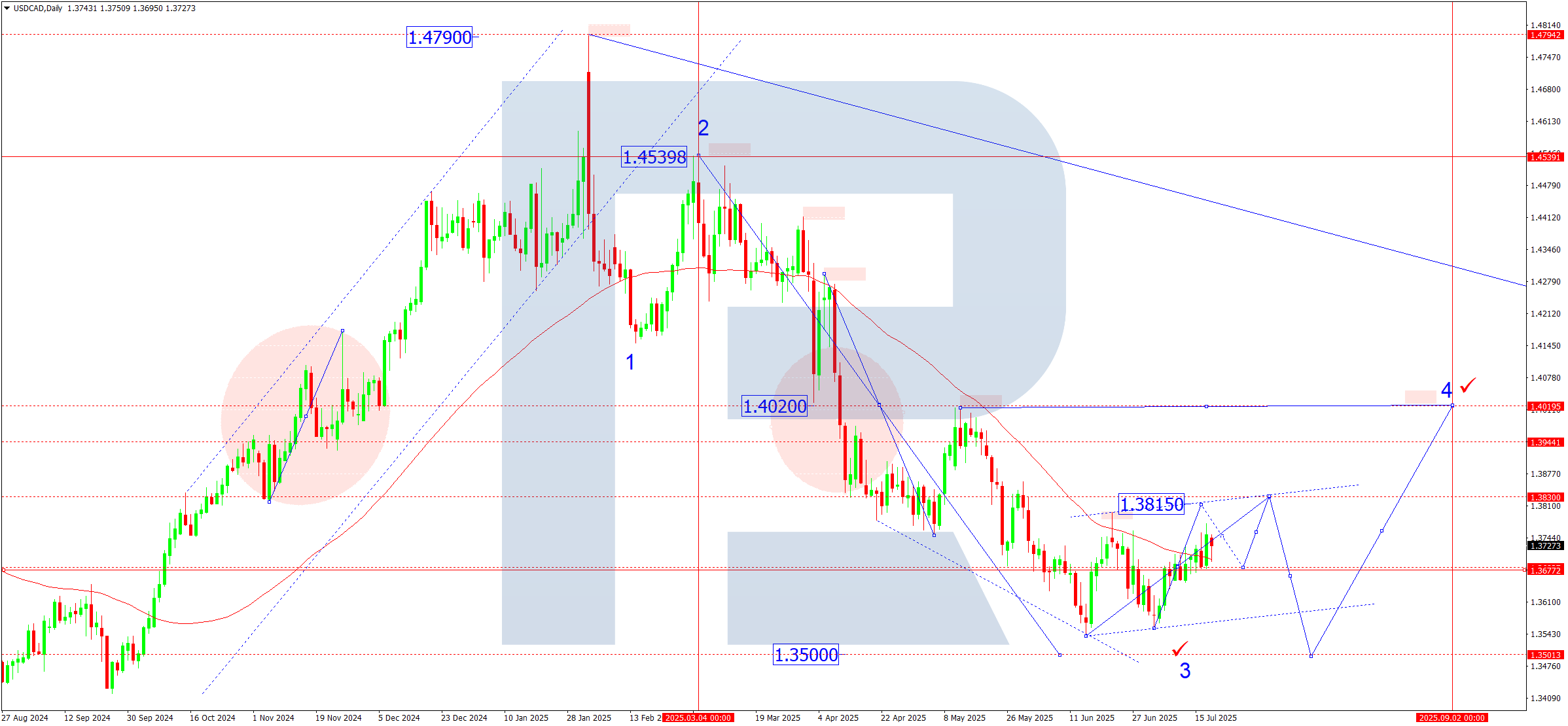 Holding above 1.3727 opens further upside potential towards 1.3815-1.3838. The main correction target lies at 1.4000.