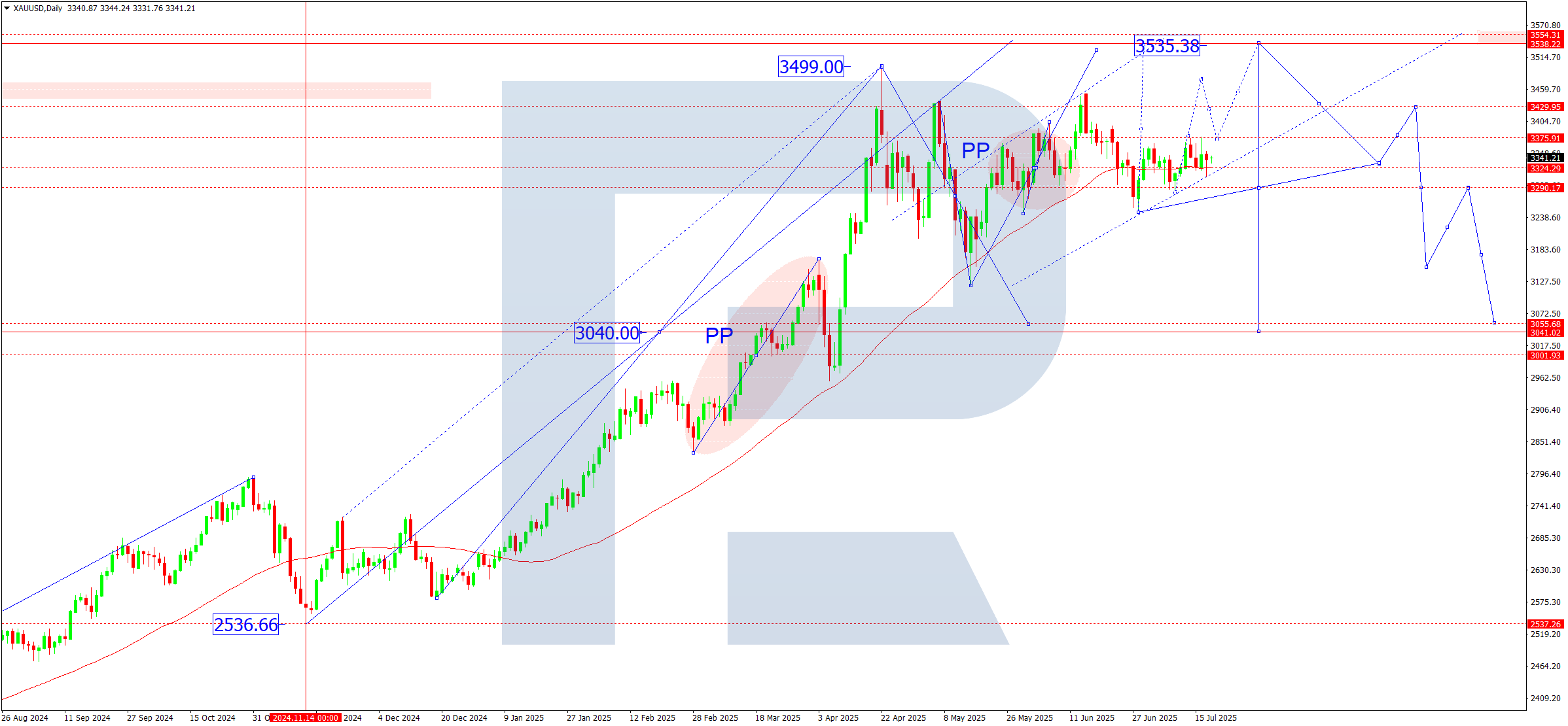 However, the current structure is forming a broadening triangle – a potential signal for a major correction. A breakout below 3,290 would confirm the reversal scenario, with downside targets at 3,050-3,040, where a major support level lies.
