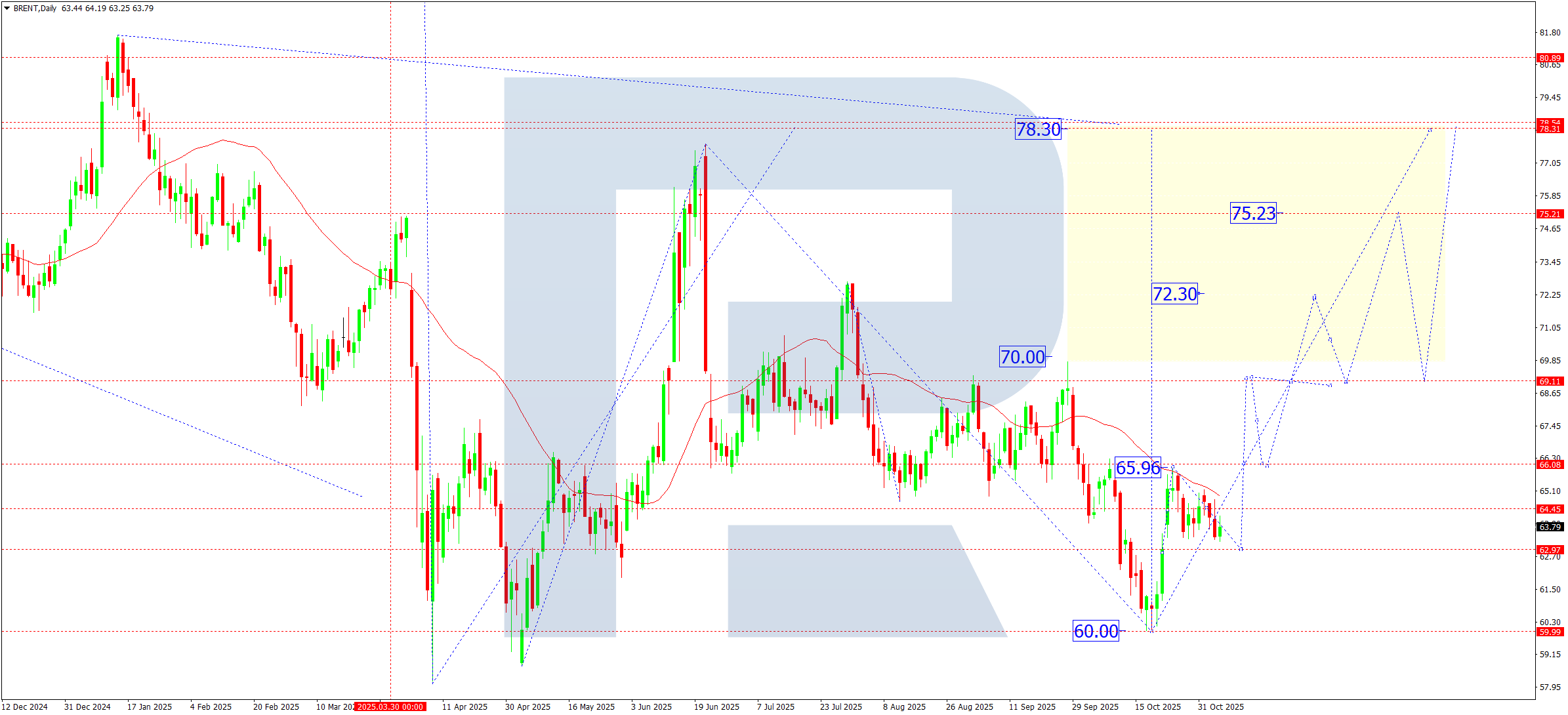 On the daily chart, Brent crude is forming a corrective wave towards 63.00. This week, prices are expected to complete this correction and begin to reverse upwards. Next, a new bullish wave is expected to develop towards 64.50, which is the nearest key resistance level. A breakout above 64.50 would trigger an acceleration phase, opening potential for a move to 69.10, the local estimated target of the current upward impulse. The main target of the entire bullish structure is 78.30.