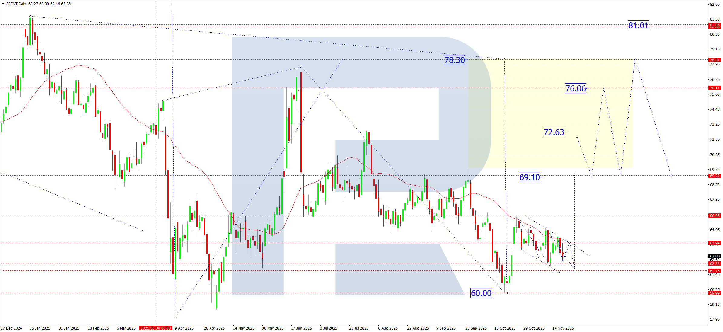The oil market enters the last week of November amid a moderate reduction in supply-shortage risk and heightened uncertainty regarding the global economy. The key factor is a gradual recovery of output in several OPEC+ countries, primarily Saudi Arabia and Iraq, which pressures prices, limiting upside potential in the short term. At the same time, medium-term support for prices comes from demand expectations in Asia: data from China indicate stabilisation in the industrial sector. In the US, the supply adjustment cycle continues: shale producers’ activity remains below annual averages, and official EIA forecasts point to slower supply growth in Q1 2026. Additional support is provided by declines in US commercial inventories in recent weeks. The geopolitical backdrop is mixed. Flare-ups on certain transport routes are not causing systemic supply disruptions, but the market retains a risk premium given prolonged instability in the Middle East. Any new developments in the region can trigger short-term volatility spikes. Market participants are also evaluating prospects for the December OPEC+ meeting, where the strategy of flexible output management may be reaffirmed. The scenario of maintaining current quotas looks more likely, supporting expectations of market rebalancing by year-end. Overall, the fundamental backdrop for Brent remains moderately neutral: short-term price pressure persists due to rising supply, but the medium-term balance still leans towards a gradual price recovery if there are no external shocks.