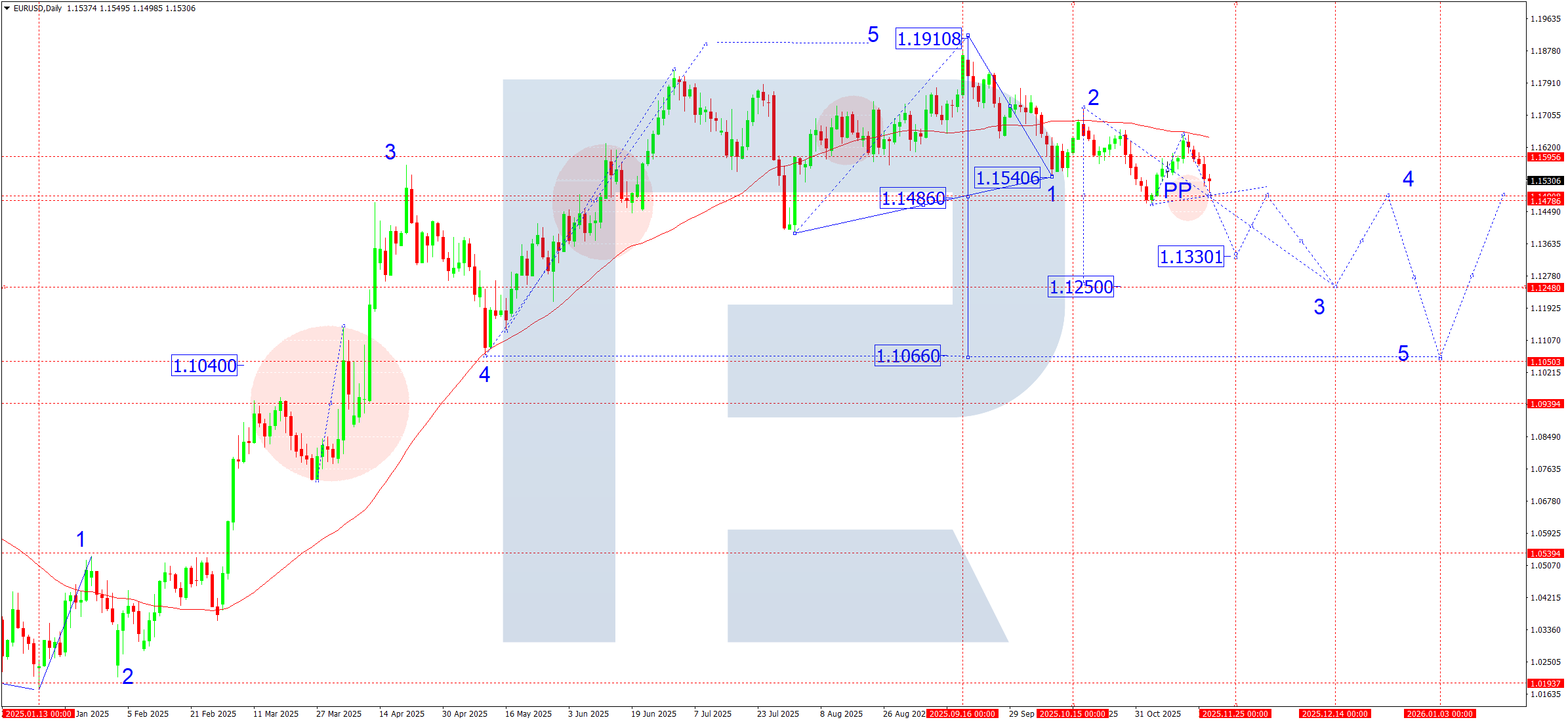 Since the 1.1499 level may act as a structural pivot point (PP), the overall target of the current downward wave is projected at 1.1066. This level coincides with the estimated third wave according to the PP structure.