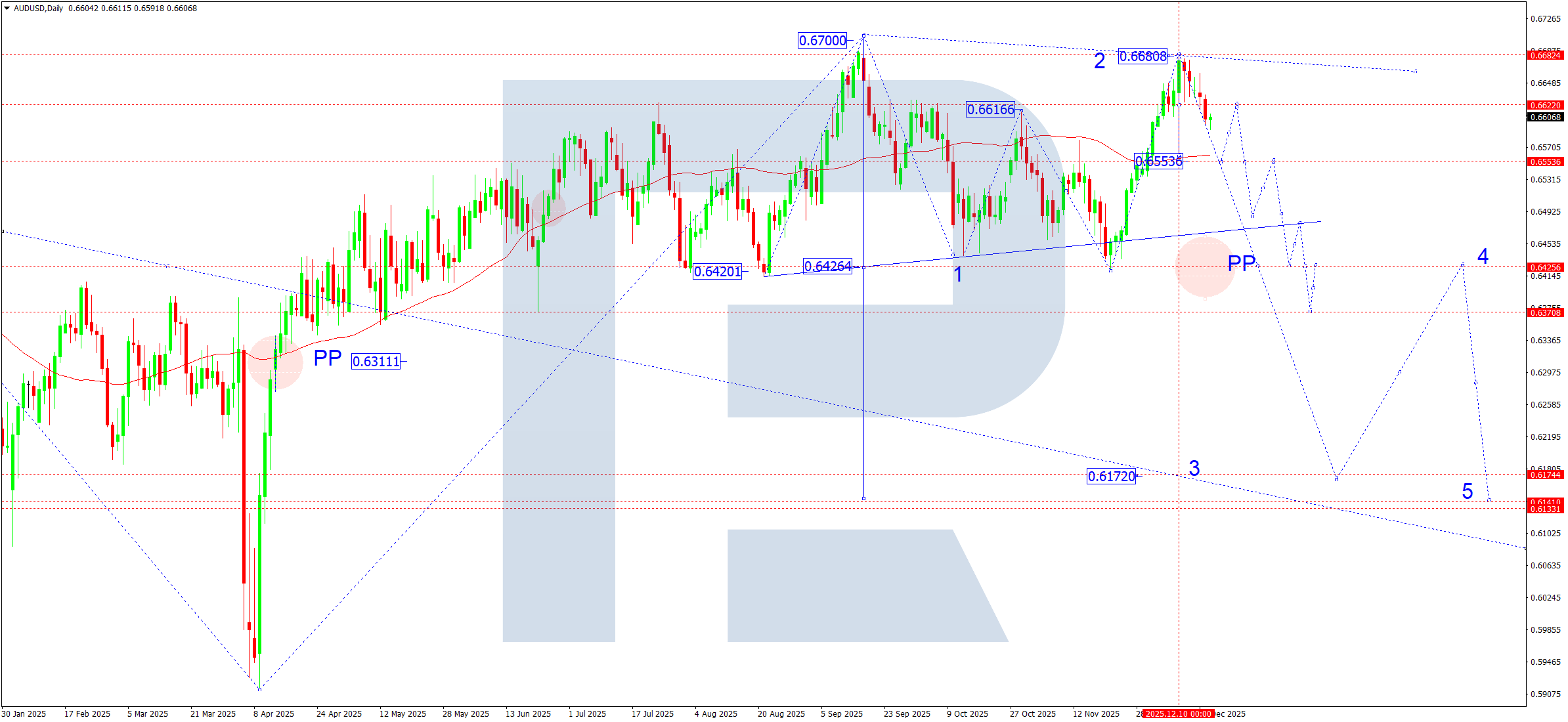 On the daily chart, AUDUSD formed a consolidation range around 0.6555, from which the market broke upwards and delivered a corrective move to the 0.6680 area. This rise is viewed исключительно as a correction within a larger downwards structure.