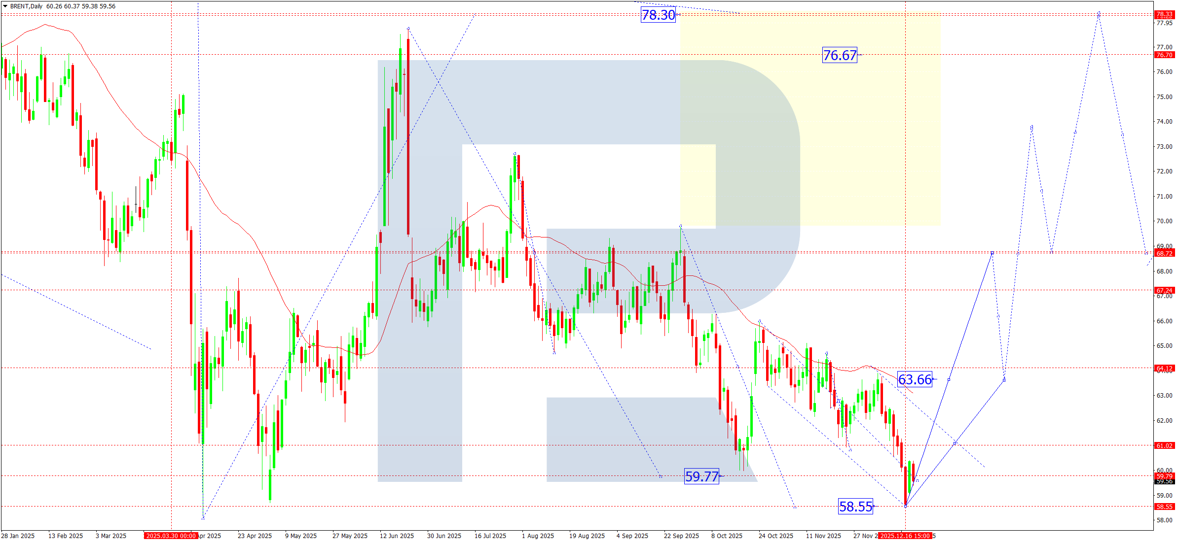 On the daily chart, Brent crude completed the formation of a downward wave structure by reaching 58.55, which now acts as a key support zone.
