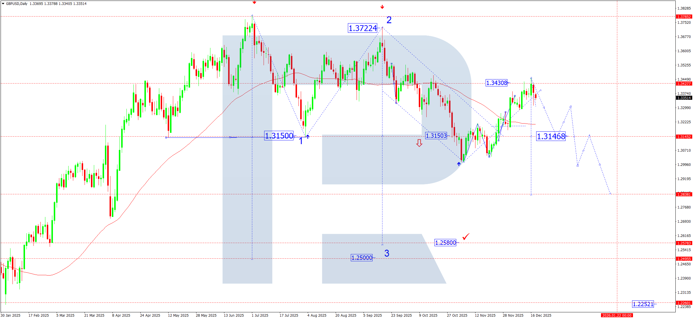 Within the current structure, we expect the start of a downward leg with the first target in the 1.3145–1.3150 area. This level is important because it: