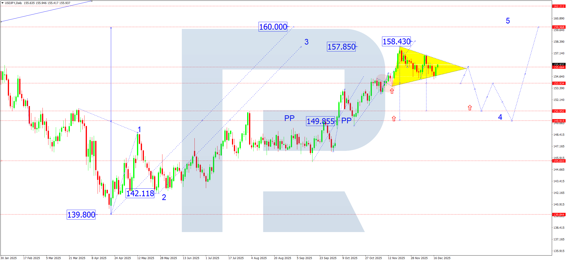 The USDJPY pair keeps a medium-term upwards trend, although the market has now moved into a phase of local correction and consolidation after reaching the calculated local target of the growth wave. The fundamental backdrop remains moderately supportive for the US dollar, while the yen continues to face structural pressure from the Bank of Japan’s monetary policy.