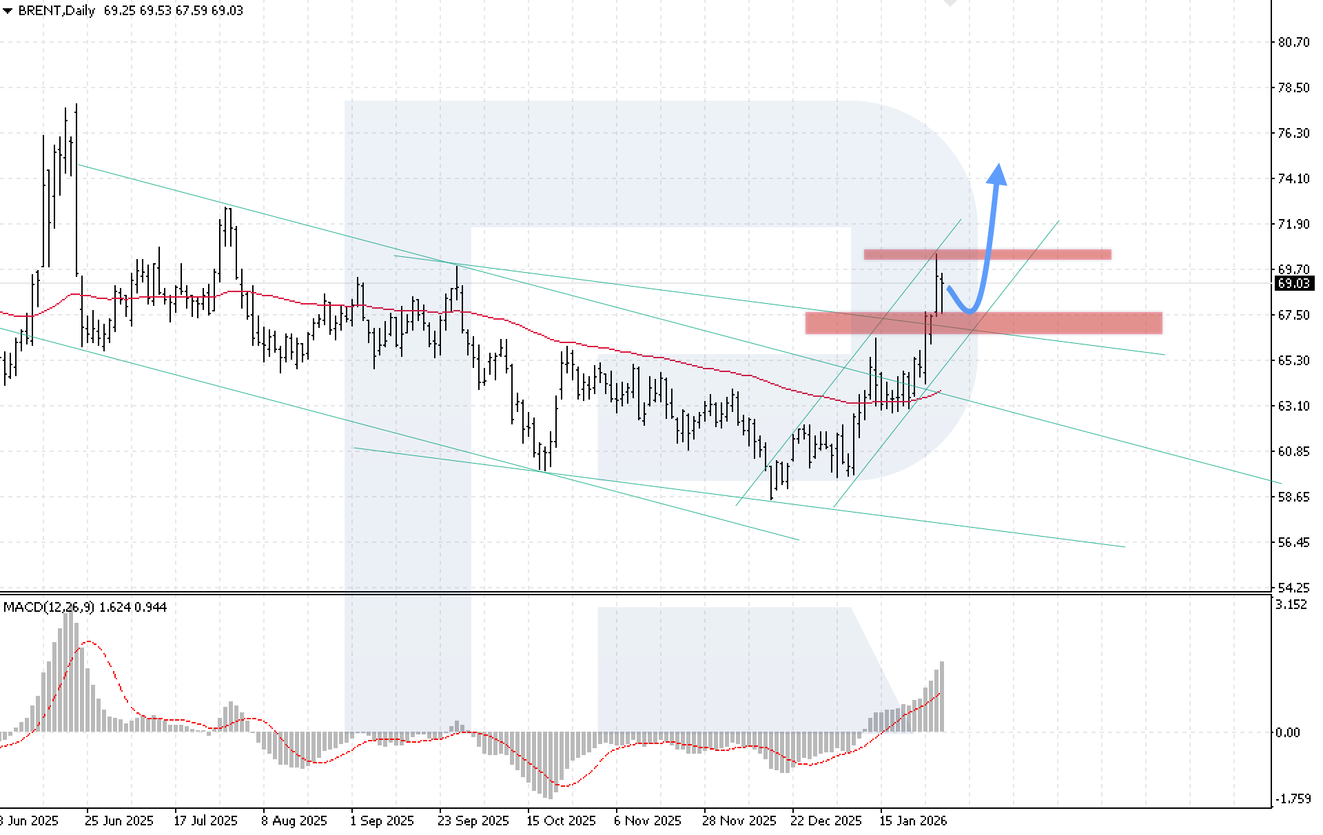 Additional support over the month came from geopolitical instability in Venezuela, production disruptions in Kazakhstan, and weather-related production shutdowns in the US. Together, these factors are keeping oil prices high and creating the preconditions for the downtrend to end, with the market transitioning into a sustained bullish momentum phase.
