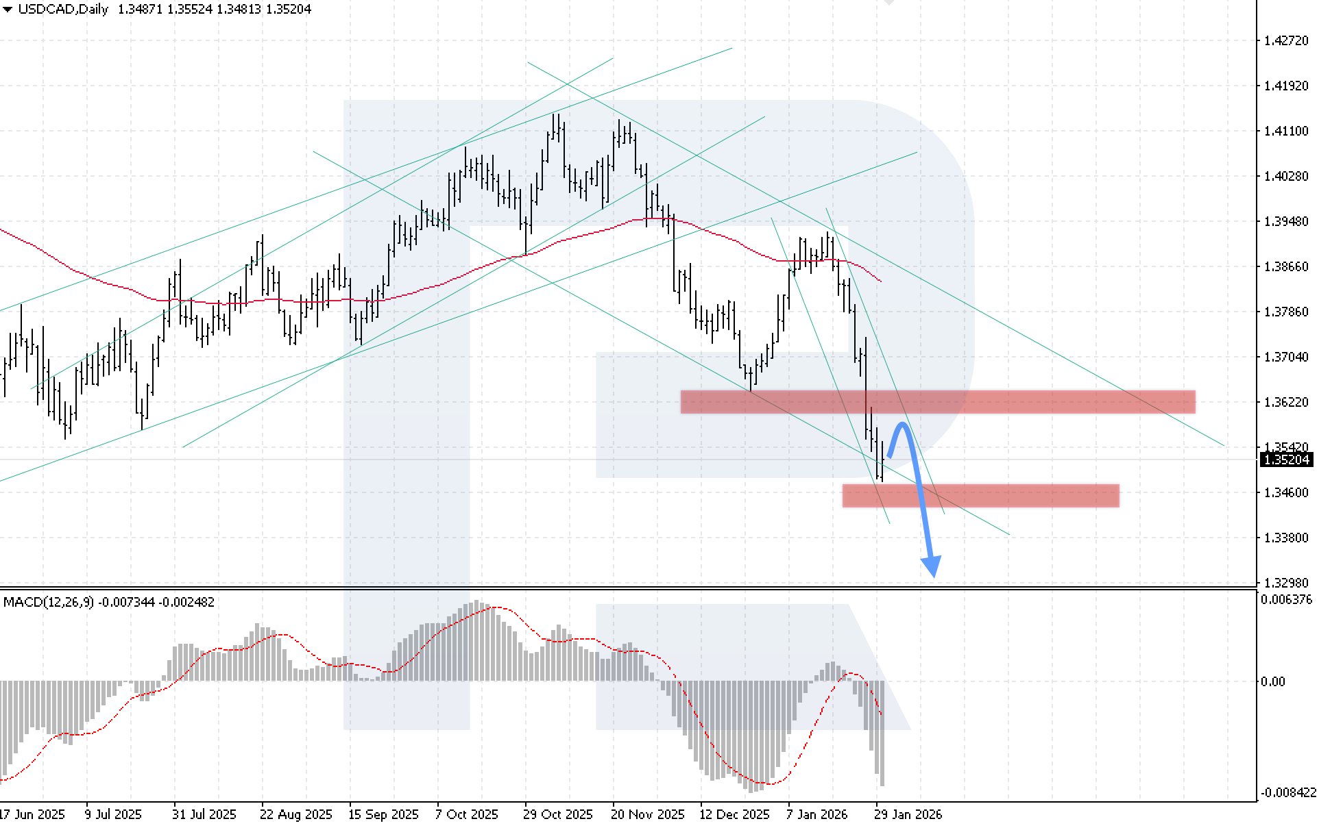 An alternative scenario becomes relevant if the 1.3625 resistance level is broken. This would signal a return to the bullish channel and could push the rate higher towards 1.3705.