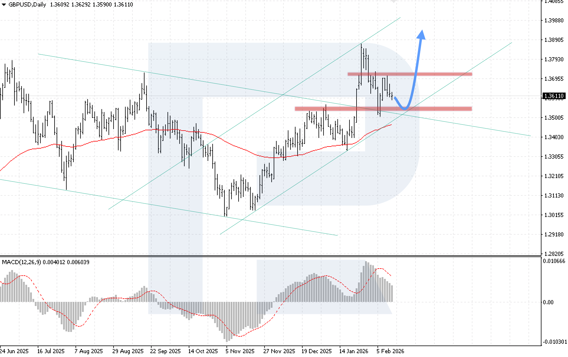 The GBPUSD pair is moving within a correction phase, but buyers continue to hold the price above the key support level at 1.3565, maintaining the potential for stabilisation and renewed demand. The pound came under pressure from weaker-than-expected UK growth data. According to the preliminary estimate, the UK economy grew by only 0.1% in Q4 2025 versus the previous three months, while analysts had forecast 0.2% growth.