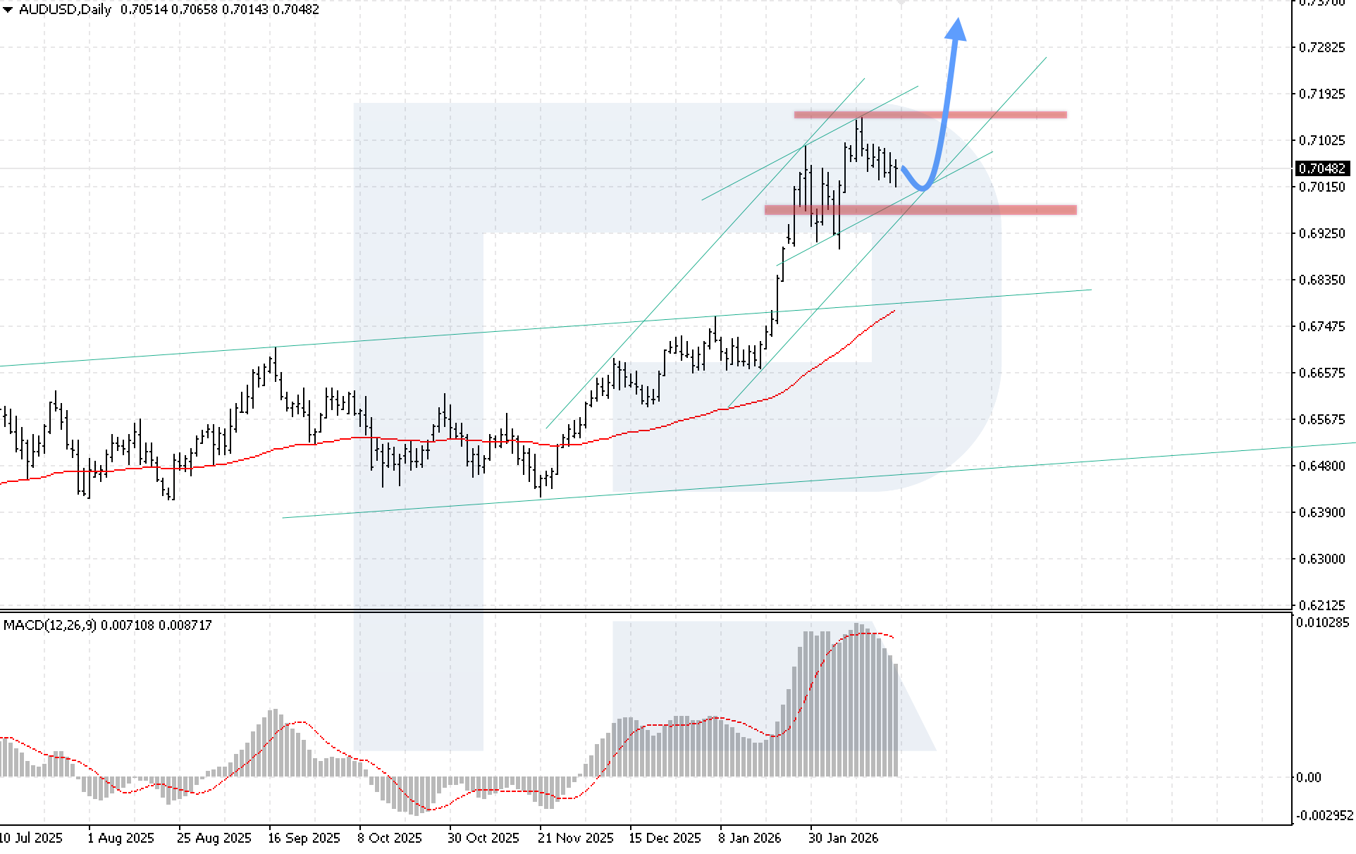 Bullish scenario (baseline): a rebound from the lower boundary of the bullish channel at current levels would indicate a continued upward move towards 0.7345, while a breakout above the local resistance level would only strengthen this scenario.
