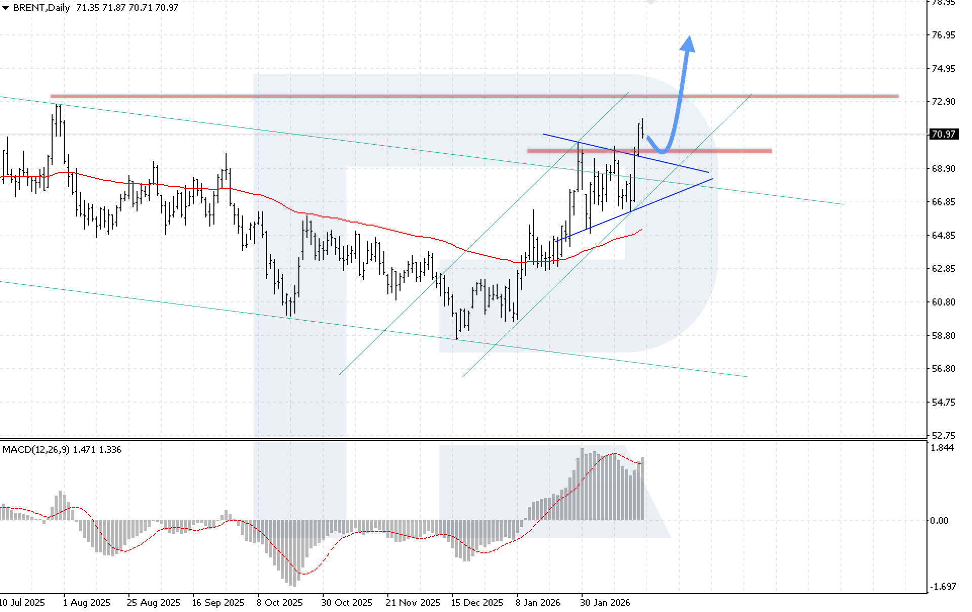 MACD confirms the growth phase: the histogram is rising actively, although buyers may face the formation of a bearish divergence. A key condition for the bullish scenario this week is consolidation above 72.90 USD.