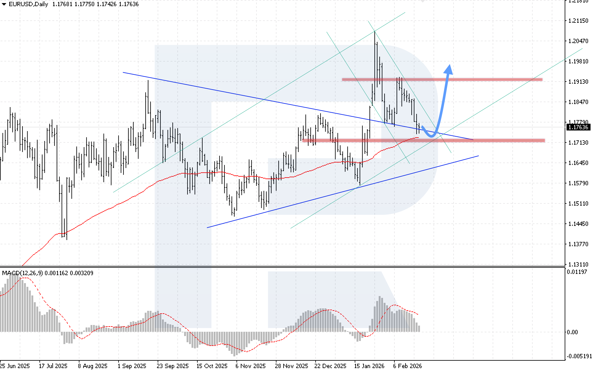 Bearish scenario (alternative): a breakout below the 1.1695 support level would signal a return to the Triangle pattern and indicate a downward correction, with a target near 1.1545.