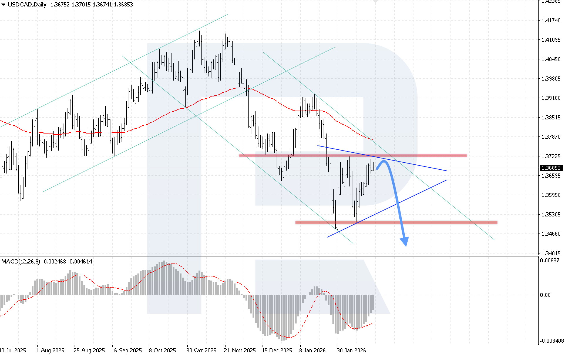 The USDCAD pair ended the week higher, but prices remain within a consolidation channel with an upper boundary at 1.3715 and a lower boundary at 1.3495. The Canadian dollar came under pressure due to slowing domestic inflation: the CPI fell to 2.3% in January, while cooling housing inflation confirms easing price pressure and reduces the likelihood of renewed monetary tightening.