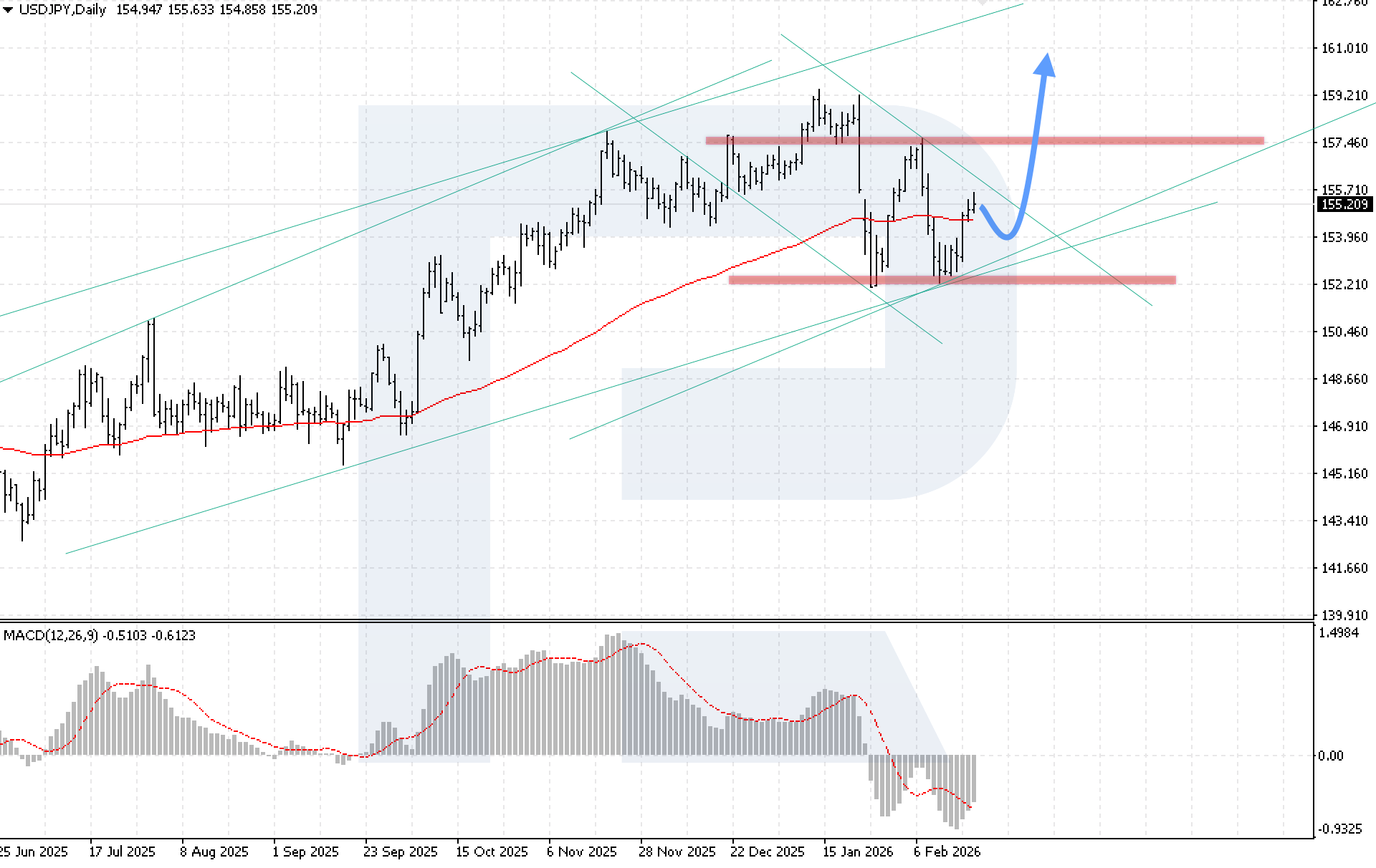 The USDJPY pair posted a sharp and aggressive rise last week after rebounding from the key support level at 152.25. Pressure on the yen intensified amid expectations of Federal Reserve actions, as well as a slowdown in both headline and core inflation in Japan in January, creating favourable conditions for the dollar to strengthen. Headline inflation fell from 2.1% to 1.5%, the lowest since March 2022, while core inflation remained at the Bank of Japan’s 2% target, showing the slowest growth in two years.